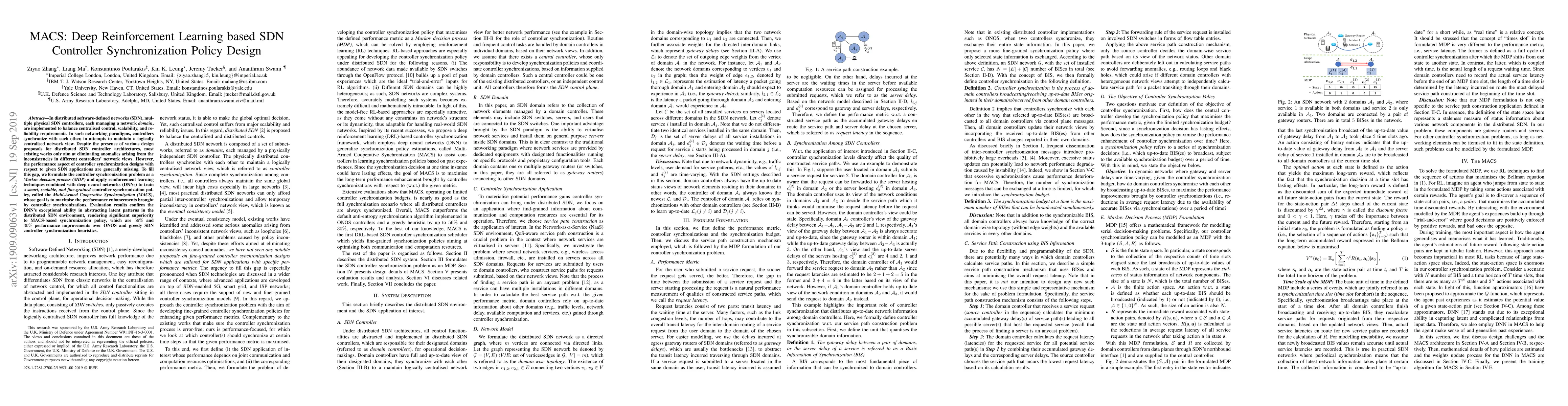 This paper proposes MACS, a deep reinforcement learning-based synchronization policy for distributed SDN controllers, formulated as a Markov decision process. Evaluations show MACS achieves 56% and 30% performance improvements over existing synchronization methods, highlighting its effectiveness in enhancing controller synchronization.