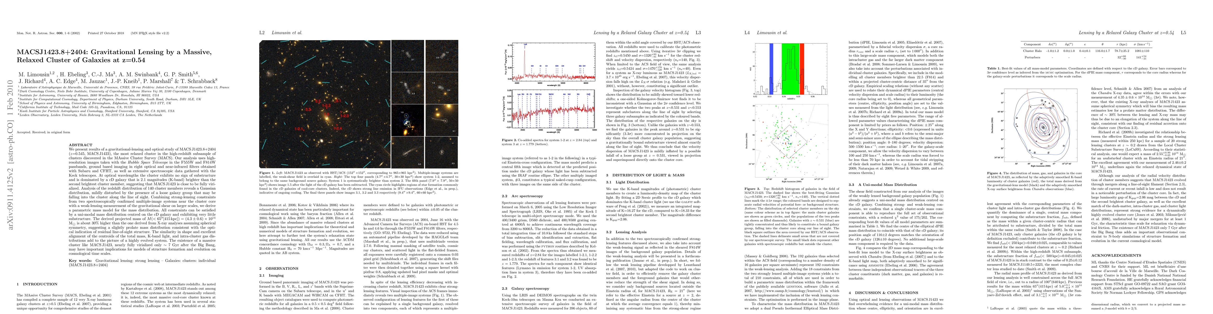 We present results of a gravitational-lensing and optical study of MACS ,J1423.8+2404 (z=0.545, MACS, J1423). Our analysis uses high-resolution images taken with the Hubble Space Telescope in the F555W and F814W passbands, ground based imaging in eight optical and near-infrared filters obtained with Subaru and CFHT, as well as extensive spectroscopic data gathered with the Keck telescopes. At optical wavelengths the cluster exhibits no sign of substructure and is dominated by a cD galaxy that is 2.1 magnitudes (K-band) brighter than the second brightest cluster member, suggesting that MACS, J1423 is close to be fully virialized. Analysis of the redshift distribution of 140 cluster members reveals a Gaussian distribution, mildly disturbed by the presence of a loose galaxy group that may be falling into the cluster along the line of sight. Combining strong-lensing constraints from two spectroscopically confirmed multiple-image systems near the cluster core with a weak-lensing measurement of the gravitational shear on larger scales, we derive a parametric mass model for the mass distribution. All constraints can be satisfied by a uni-modal mass distribution centred on the cD galaxy and exhibiting very little substructure. The derived projected mass of M(<65\arcsec [415 kpc])=(4.3\pm0.6)\times 10^{14} M_sun is about 30% higher than the one derived from X-ray analyses assuming spherical symmetry, suggesting a slightly prolate mass distribution consistent with the optical indication of residual line-of-sight structure. The similarity in shape and excellent alignment of the centroids of the total mass, K-band light, and intra-cluster gas distributions add to the picture of a highly evolved system [ABRIDGED]