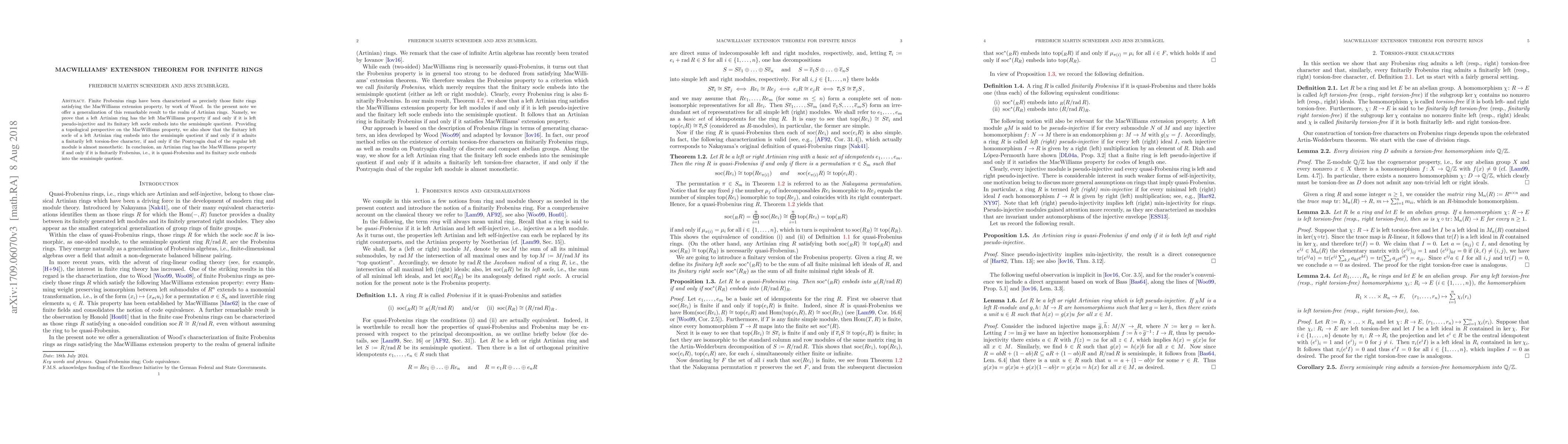 This paper generalizes MacWilliams' extension theorem to left Artinian rings, proving they possess the left MacWilliams property if and only if they are left pseudo-injective and their finitary left socle embeds into the semisimple quotient. The study also connects this property to topological characteristics and concludes that an Artinian ring is finitarily Frobenius if it meets these conditions.