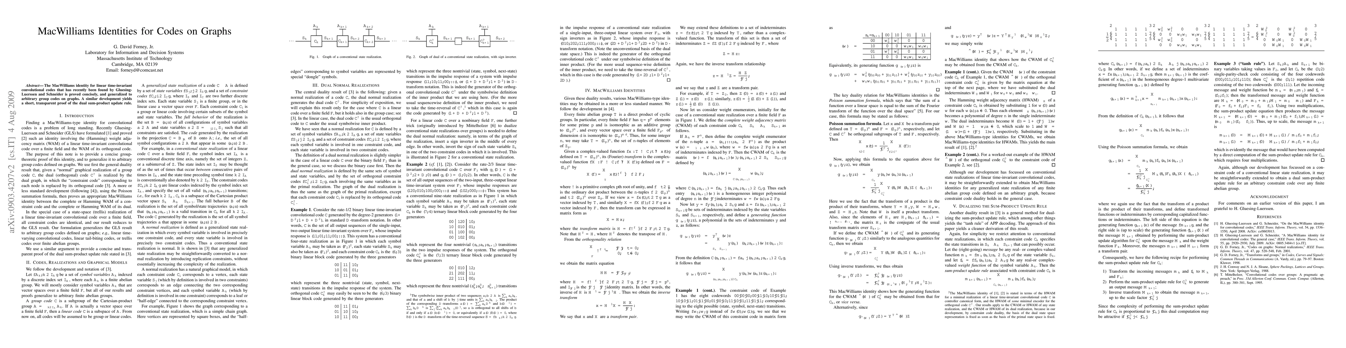 The MacWilliams identity for linear time-invariant convolutional codes that has recently been found by Gluesing-Luerssen and Schneider is proved concisely, and generalized to arbitrary group codes on graphs. A similar development yields a short, transparent proof of the dual sum-product update rule.