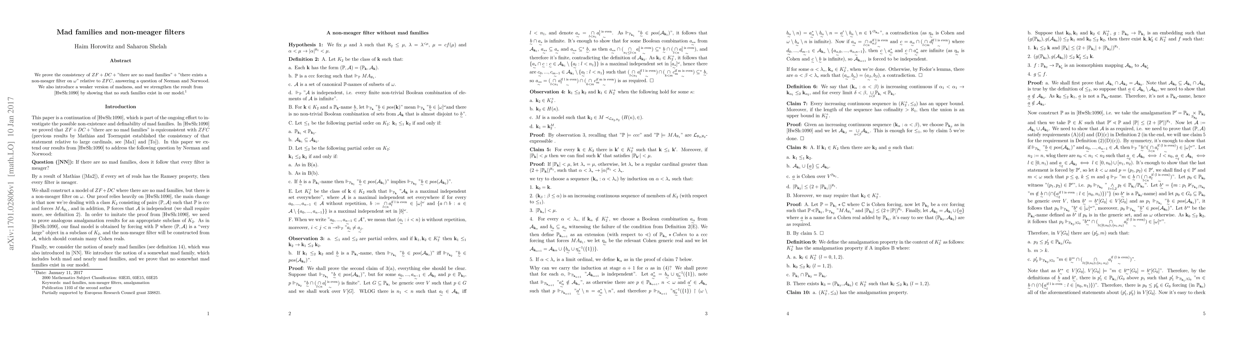 This paper proves the consistency of ZF+DC+"no mad families exist"+"there is a non-meager filter on $\omega$" relative to ZFC, addressing a question posed by Neeman and Norwood. It also introduces a weaker form of madness and strengthens previous results by demonstrating the non-existence of such families in the constructed model.