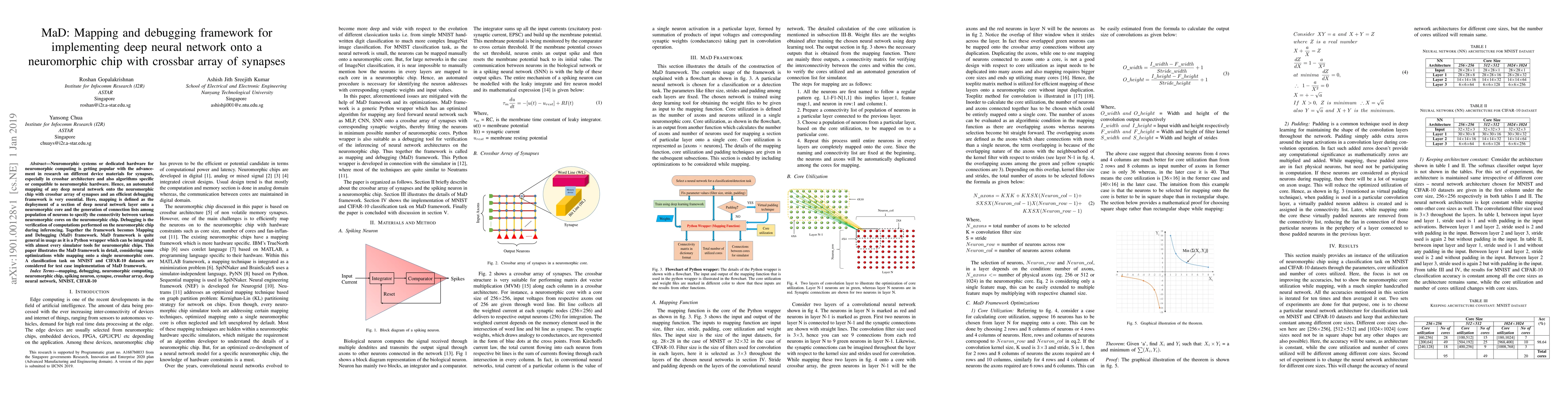 Neuromorphic systems or dedicated hardware for neuromorphic computing is getting popular with the advancement in research on different device materials for synapses, especially in crossbar architecture and also algorithms specific or compatible to neuromorphic hardware. Hence, an automated mapping of any deep neural network onto the neuromorphic chip with crossbar array of synapses and an efficient debugging framework is very essential. Here, mapping is defined as the deployment of a section of deep neural network layer onto a neuromorphic core and the generation of connection lists among population of neurons to specify the connectivity between various neuromorphic cores on the neuromorphic chip. Debugging is the verification of computations performed on the neuromorphic chip during inferencing. Together the framework becomes Mapping and Debugging (MaD) framework. MaD framework is quite general in usage as it is a Python wrapper which can be integrated with almost every simulator tools for neuromorphic chips. This paper illustrates the MaD framework in detail, considering some optimizations while mapping onto a single neuromorphic core. A classification task on MNIST and CIFAR-10 datasets are considered for test case implementation of MaD framework.