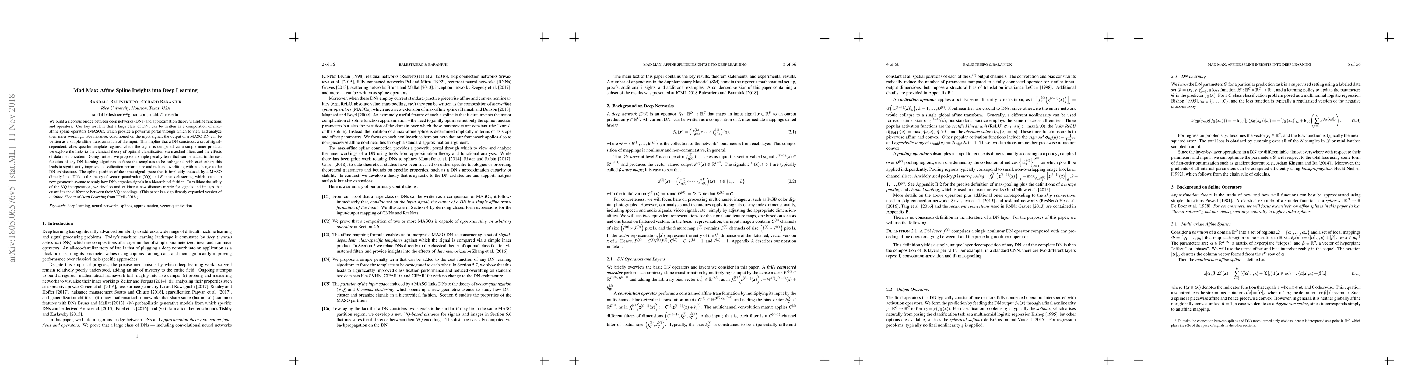 We build a rigorous bridge between deep networks (DNs) and approximation theory via spline functions and operators. Our key result is that a large class of DNs can be written as a composition of max-affine spline operators (MASOs), which provide a powerful portal through which to view and analyze their inner workings. For instance, conditioned on the input signal, the output of a MASO DN can be written as a simple affine transformation of the input. This implies that a DN constructs a set of signal-dependent, class-specific templates against which the signal is compared via a simple inner product; we explore the links to the classical theory of optimal classification via matched filters and the effects of data memorization. Going further, we propose a simple penalty term that can be added to the cost function of any DN learning algorithm to force the templates to be orthogonal with each other; this leads to significantly improved classification performance and reduced overfitting with no change to the DN architecture. The spline partition of the input signal space that is implicitly induced by a MASO directly links DNs to the theory of vector quantization (VQ) and $K$-means clustering, which opens up new geometric avenue to study how DNs organize signals in a hierarchical fashion. To validate the utility of the VQ interpretation, we develop and validate a new distance metric for signals and images that quantifies the difference between their VQ encodings. (This paper is a significantly expanded version of A Spline Theory of Deep Learning from ICML 2018.)