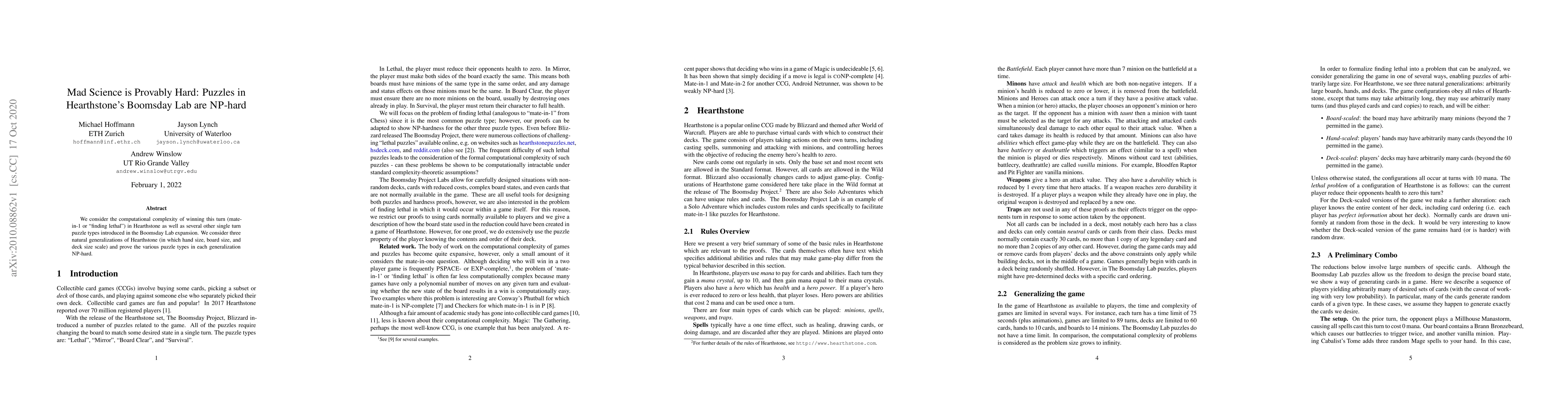 This paper demonstrates that winning in one turn in Hearthstone's Boomsday Lab expansion, including several puzzle types, is NP-hard. It generalizes the complexity to scaled versions of the game, proving these puzzles to be computationally challenging.