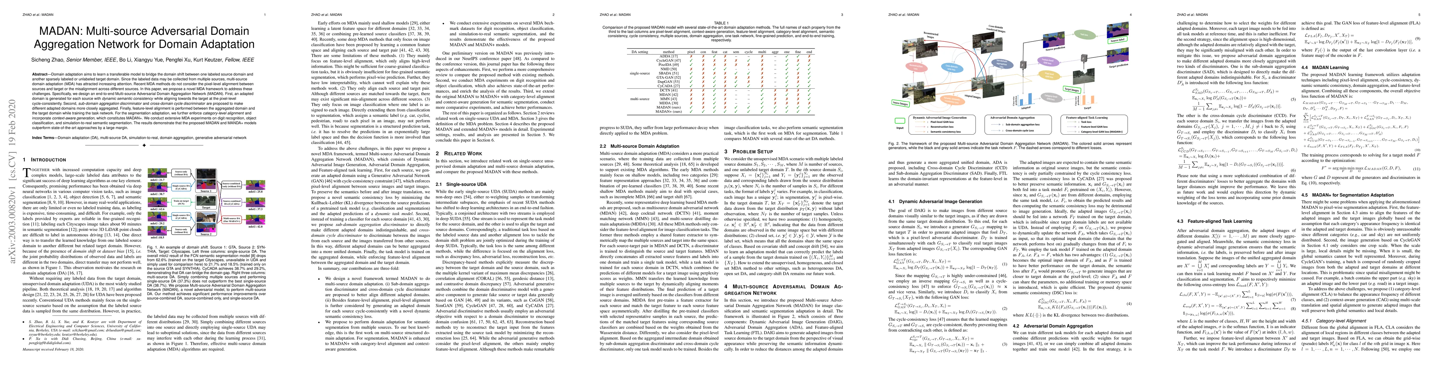 The paper introduces a novel Multi-source Adversarial Domain Aggregation Network (MADAN) to improve multi-source domain adaptation, addressing pixel-level misalignment across domains and achieving better feature-level alignment between source and target domains. The enhanced MADAN+ variant incorporates context-aware generation and category-level alignment, outperforming existing methods in various adaptation tasks.