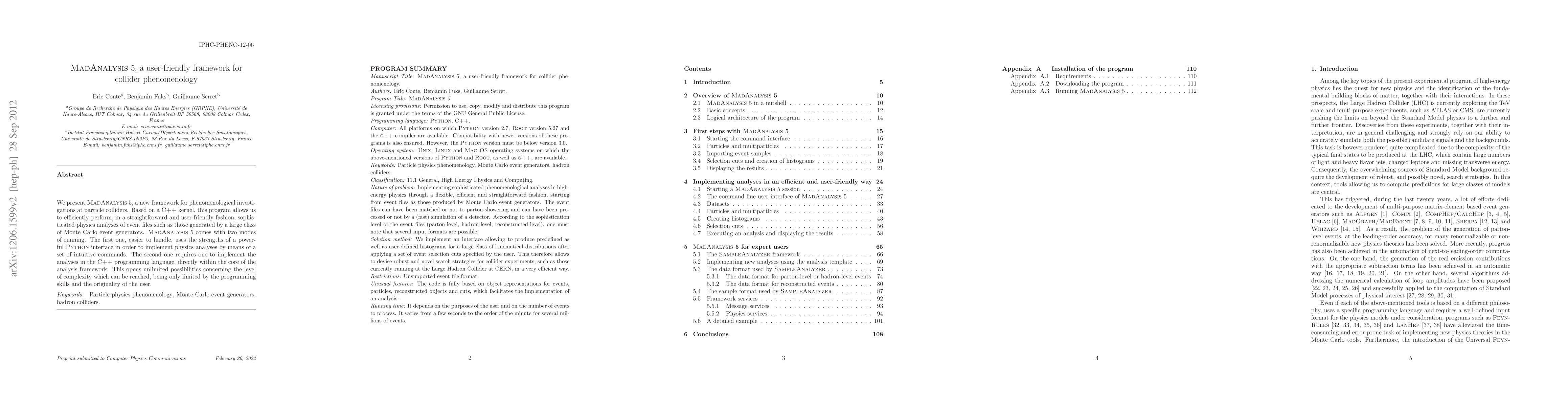 MadAnalysis 5 is a user-friendly framework for collider phenomenology, offering sophisticated analysis of event files generated by Monte Carlo simulations. It features a Python interface for ease of use and a C++ core for advanced, customizable analyses.