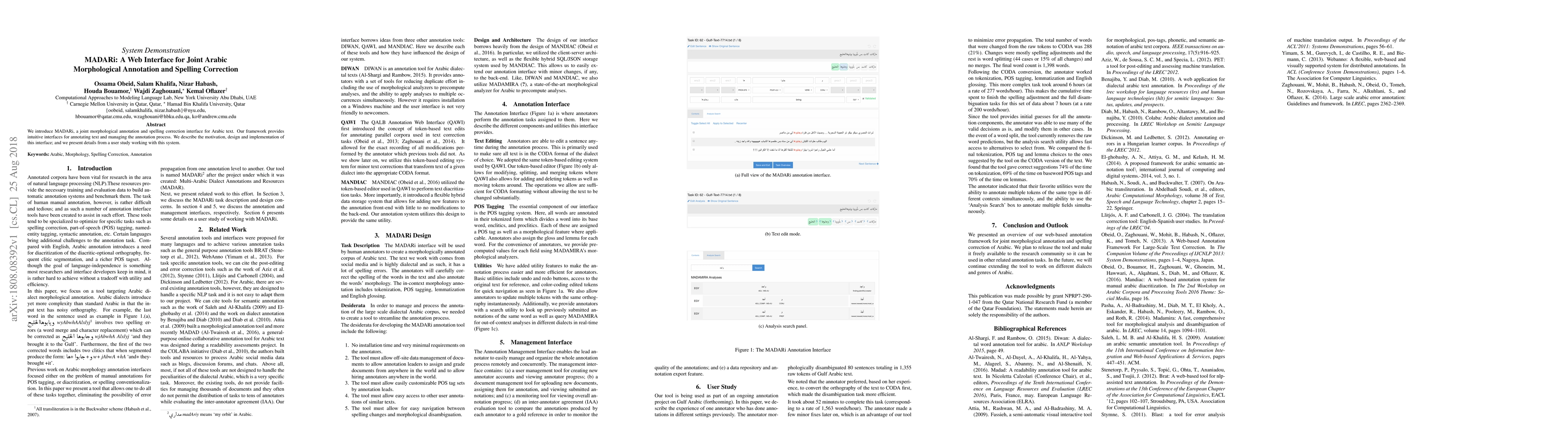 MADARi is a web interface designed for joint morphological annotation and spelling correction in Arabic texts, featuring tools to enhance annotator productivity and manage large document sets. The system includes pre-computed analyses and a management interface for remote, concurrent annotation processes.