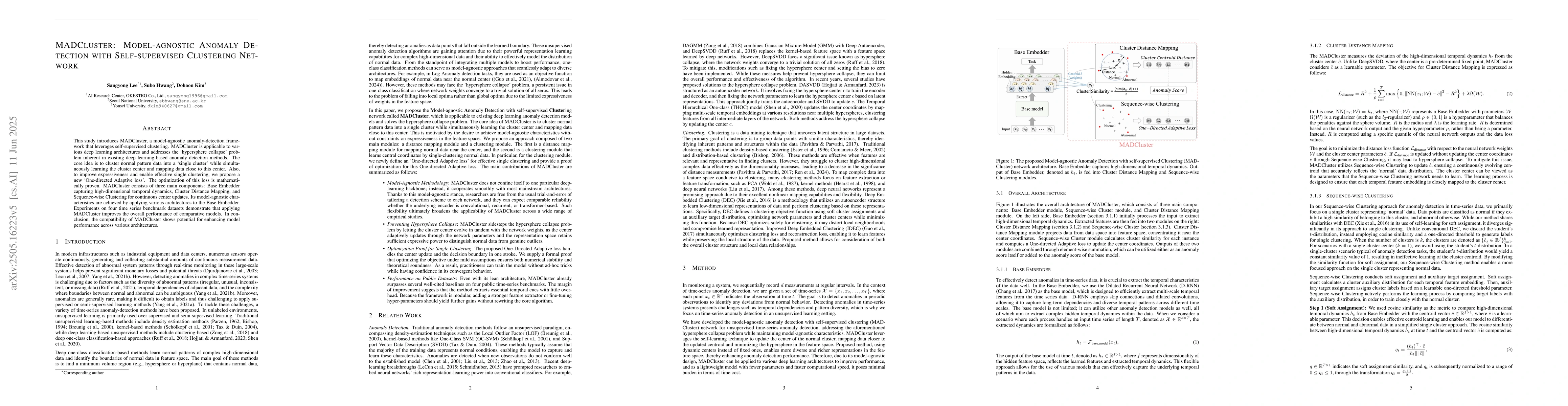 MADCluster proposes a model-agnostic anomaly detection framework that uses self-supervised clustering to improve performance across various deep learning architectures, outperforming existing methods on four time series benchmark datasets.