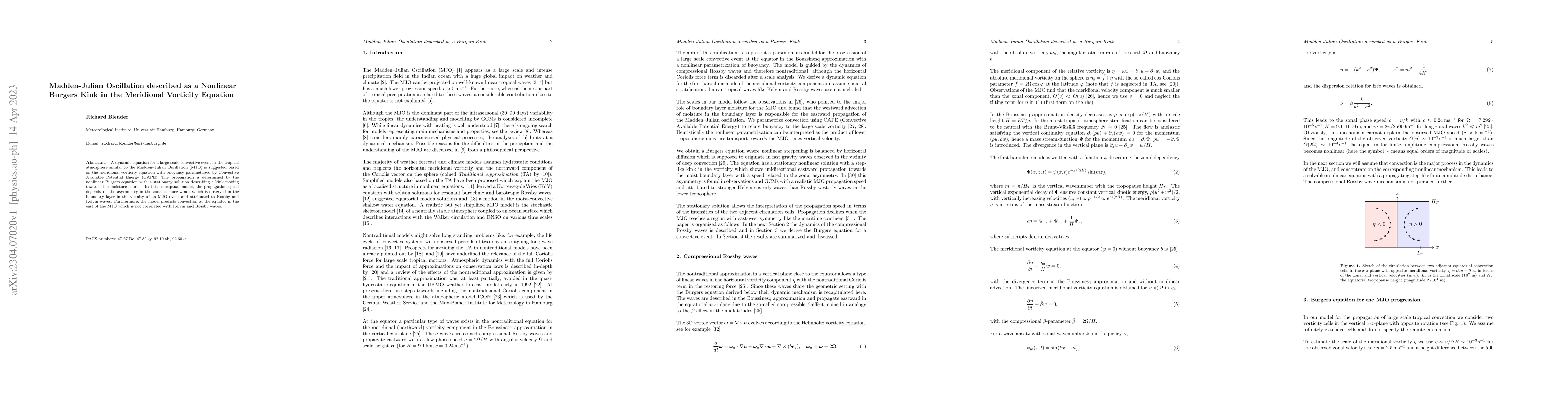 This paper proposes a dynamic model for the Madden-Julian Oscillation (MJO) based on the meridional vorticity equation, where the MJO is described as a nonlinear Burgers kink. The model attributes MJO propagation speed to asymmetry in zonal surface winds influenced by Rossby and Kelvin waves.