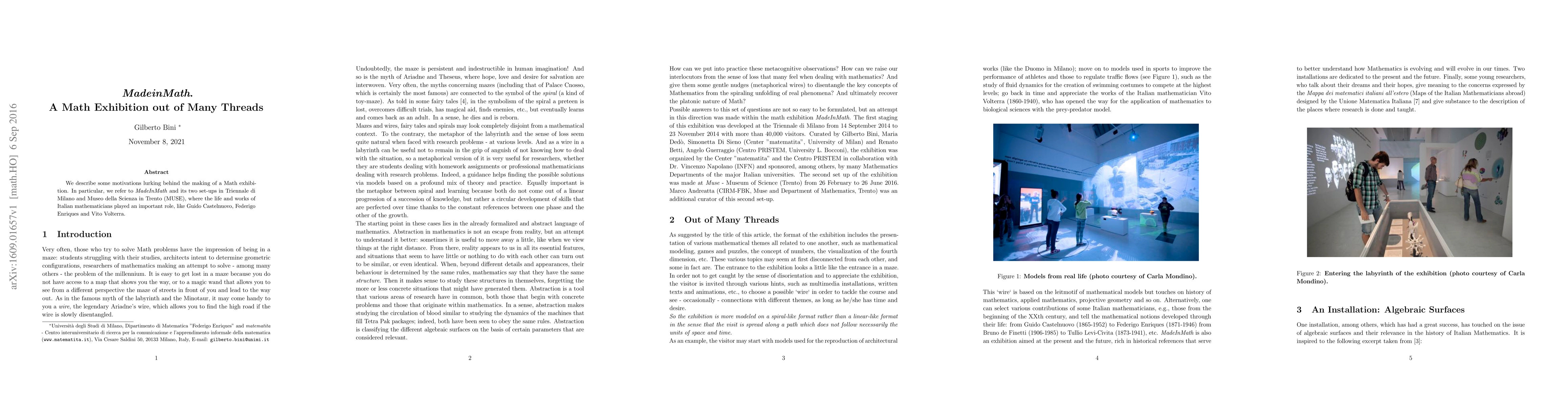 Summary: The paper discusses the motivations behind creating a Math exhibition, MadeInMath, showcasing the life and works of notable Italian mathematicians such as Guido Castelnuovo, Federigo Enriques, and Vito Volterra, with installations at Triennale di Milano and MUSE in Trento.