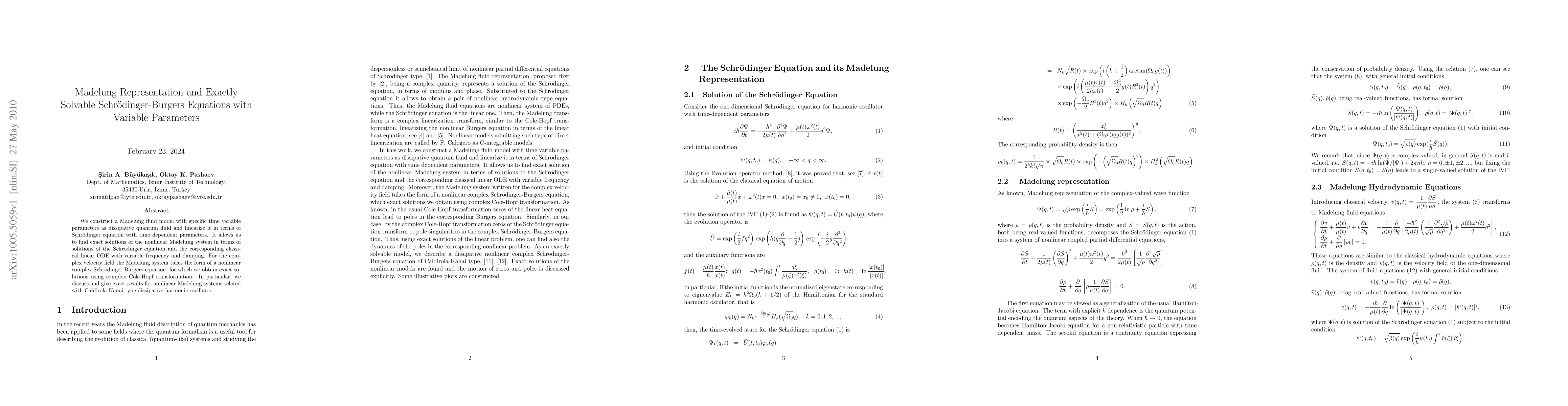 This paper constructs a Madelung fluid model with time-variable parameters and linearizes it to derive exact solutions for the nonlinear Madelung system using the Schrödinger equation and a corresponding classical linear ODE. Exact solutions for the nonlinear complex Schrödinger-Burgers equation are obtained via the complex Cole-Hopf transformation, with particular focus on the Caldirola-Kanai type dissipative harmonic oscillator.