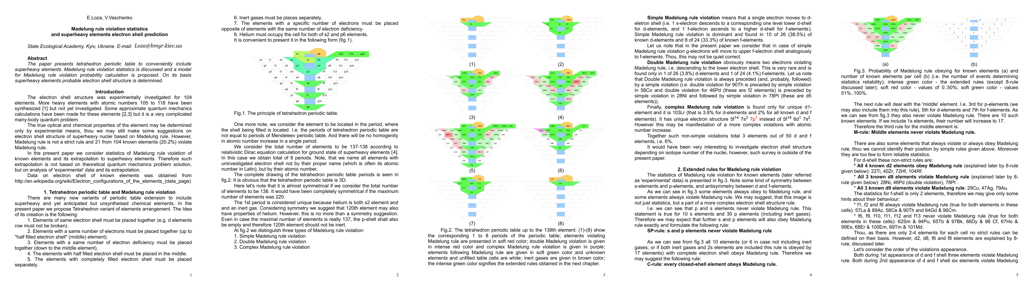 The paper introduces a tetrahedron periodic table for superheavy elements and proposes a model for calculating Madelung rule violation probabilities. It determines the probable electron shell structure of superheavy elements based on these violations.