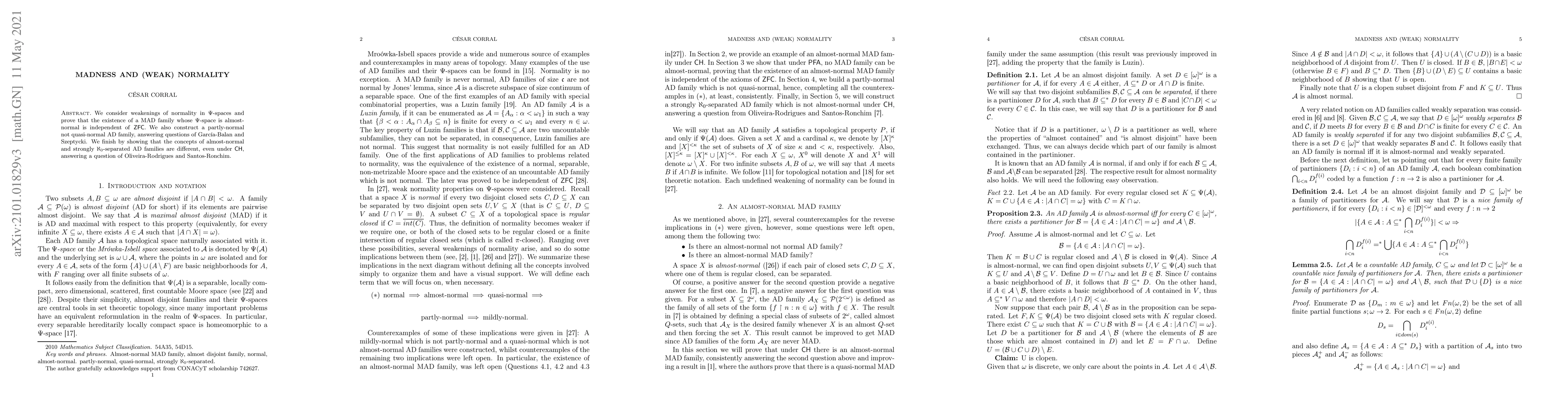 We consider weakenings of normality in $\Psi$-spaces and prove that the existence of a MAD family whose $\Psi$-space is almost-normal is independent of \textsf{ZFC}. We also construct a partly-normal not quasi-normal AD family, answering questions from Garc\'ia-Balan and Szeptycki. We finish by showing that the concepts of almost-normal and strongly $\aleph_0$-separated AD families are different, even under \textsf{CH}, answering a question from Oliveira-Rodrigues and Santos-Ronchim