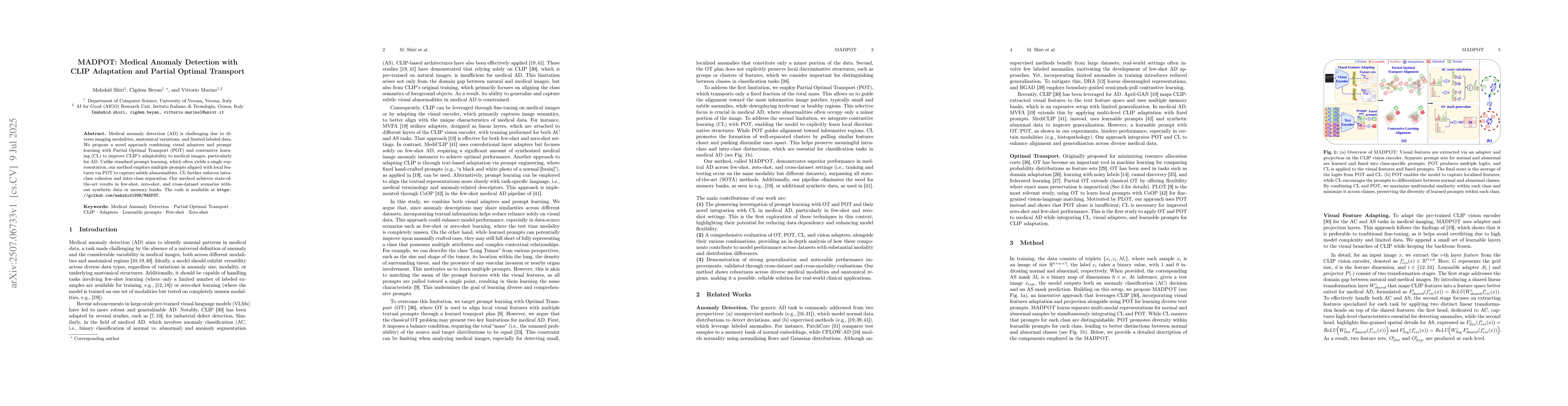 Medical anomaly detection (AD) is challenging due to diverse imaging modalities, anatomical variations, and limited labeled data. We propose a novel approach combining visual adapters and prompt learning with Partial Optimal Transport (POT) and contrastive learning (CL) to improve CLIP's adaptability to medical images, particularly for AD. Unlike standard prompt learning, which often yields a single representation, our method employs multiple prompts aligned with local features via POT to capture subtle abnormalities. CL further enforces intra-class cohesion and inter-class separation. Our method achieves state-of-the-art results in few-shot, zero-shot, and cross-dataset scenarios without synthetic data or memory banks. The code is available at https://github.com/mahshid1998/MADPOT.