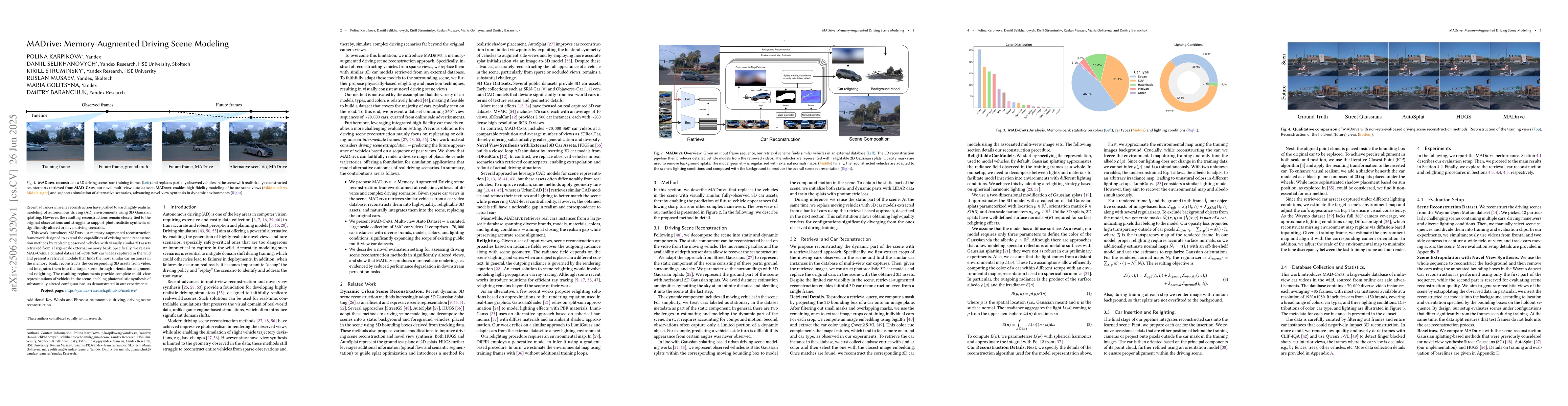 Recent advances in scene reconstruction have pushed toward highly realistic modeling of autonomous driving (AD) environments using 3D Gaussian splatting. However, the resulting reconstructions remain closely tied to the original observations and struggle to support photorealistic synthesis of significantly altered or novel driving scenarios. This work introduces MADrive, a memory-augmented reconstruction framework designed to extend the capabilities of existing scene reconstruction methods by replacing observed vehicles with visually similar 3D assets retrieved from a large-scale external memory bank. Specifically, we release MAD-Cars, a curated dataset of ${\sim}70$K 360{\deg} car videos captured in the wild and present a retrieval module that finds the most similar car instances in the memory bank, reconstructs the corresponding 3D assets from video, and integrates them into the target scene through orientation alignment and relighting. The resulting replacements provide complete multi-view representations of vehicles in the scene, enabling photorealistic synthesis of substantially altered configurations, as demonstrated in our experiments. Project page: https://yandex-research.github.io/madrive/