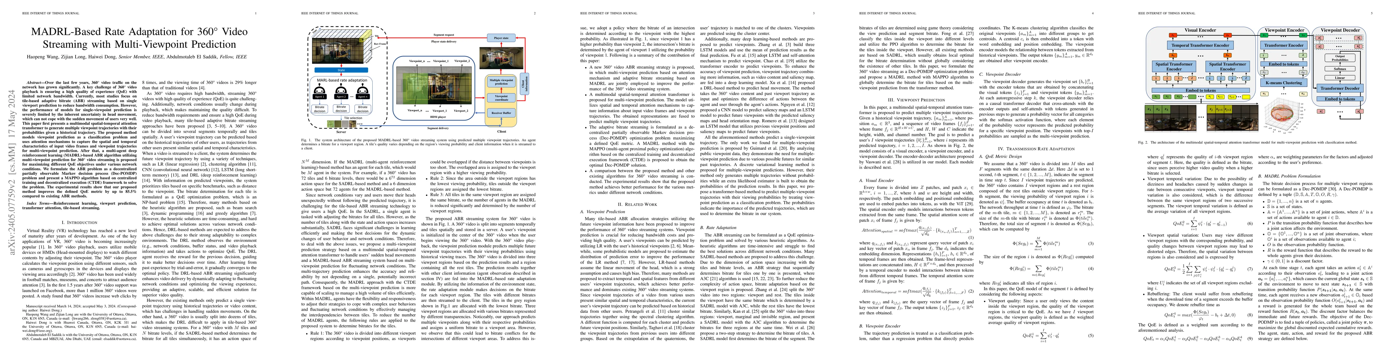 This paper proposes a multimodal spatial-temporal attention transformer for multi-viewpoint prediction in 360° video streaming, addressing the limitations of single-viewpoint models. It then introduces a MADRL-based ABR algorithm utilizing these predictions to enhance quality of experience (QoE), achieving up to 85.5% improvement over existing methods.