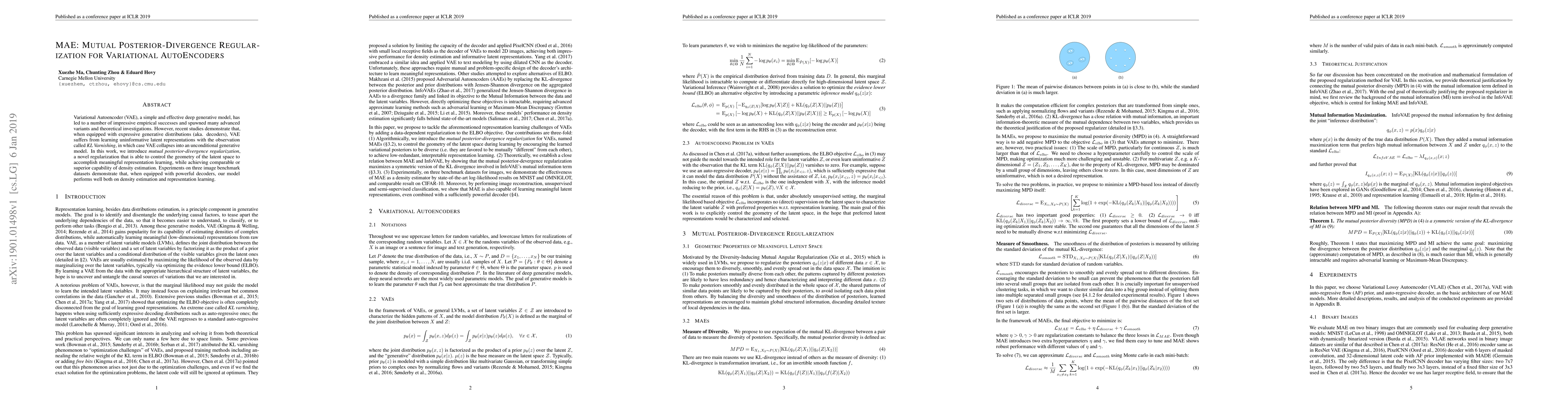 Variational Autoencoder (VAE), a simple and effective deep generative model, has led to a number of impressive empirical successes and spawned many advanced variants and theoretical investigations. However, recent studies demonstrate that, when equipped with expressive generative distributions (aka. decoders), VAE suffers from learning uninformative latent representations with the observation called KL Varnishing, in which case VAE collapses into an unconditional generative model. In this work, we introduce mutual posterior-divergence regularization, a novel regularization that is able to control the geometry of the latent space to accomplish meaningful representation learning, while achieving comparable or superior capability of density estimation. Experiments on three image benchmark datasets demonstrate that, when equipped with powerful decoders, our model performs well both on density estimation and representation learning.
