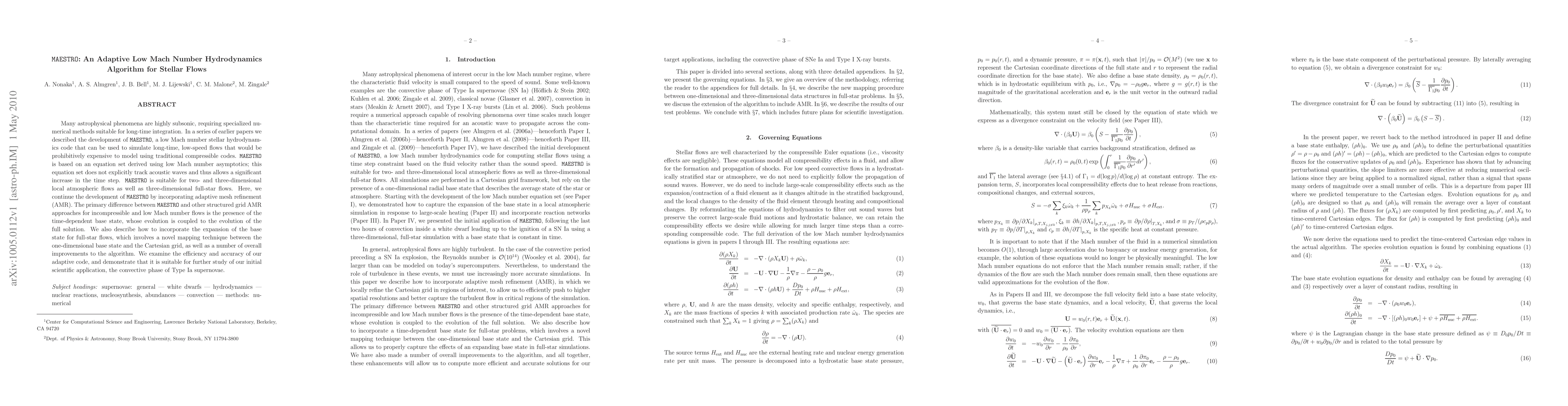 MAESTRO is an adaptive low Mach number hydrodynamics algorithm designed for simulating long-time, low-speed astrophysical flows, enhanced with adaptive mesh refinement for efficiency. The algorithm's novel coupling of the time-dependent base state with the full solution allows for significant improvements in computational efficiency and accuracy, making it suitable for studying phenomena like the convective phase of Type Ia supernovae.