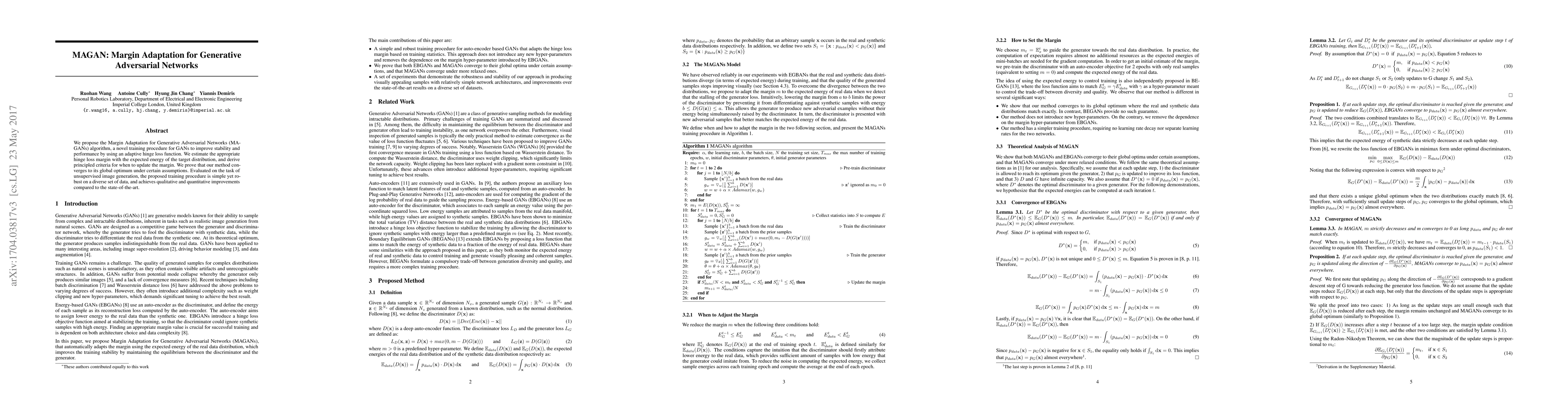 The MAGAN algorithm introduces an adaptive hinge loss function to improve the stability and performance of Generative Adversarial Networks (GANs) by dynamically adjusting the margin based on the target distribution's expected energy. This method demonstrates convergence to the global optimum and outperforms state-of-the-art techniques in unsupervised image generation.