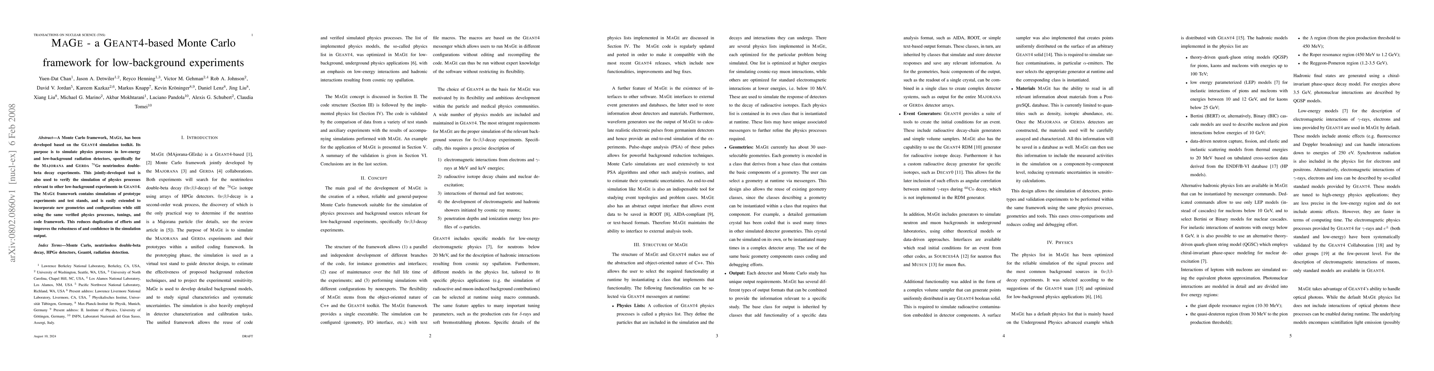 MaGe is a Monte Carlo framework based on Geant4, designed to simulate physics processes for low-energy and low-background radiation detectors, particularly for neutrinoless double-beta decay experiments. It enhances simulation efficiency and robustness for various low-background experiments.