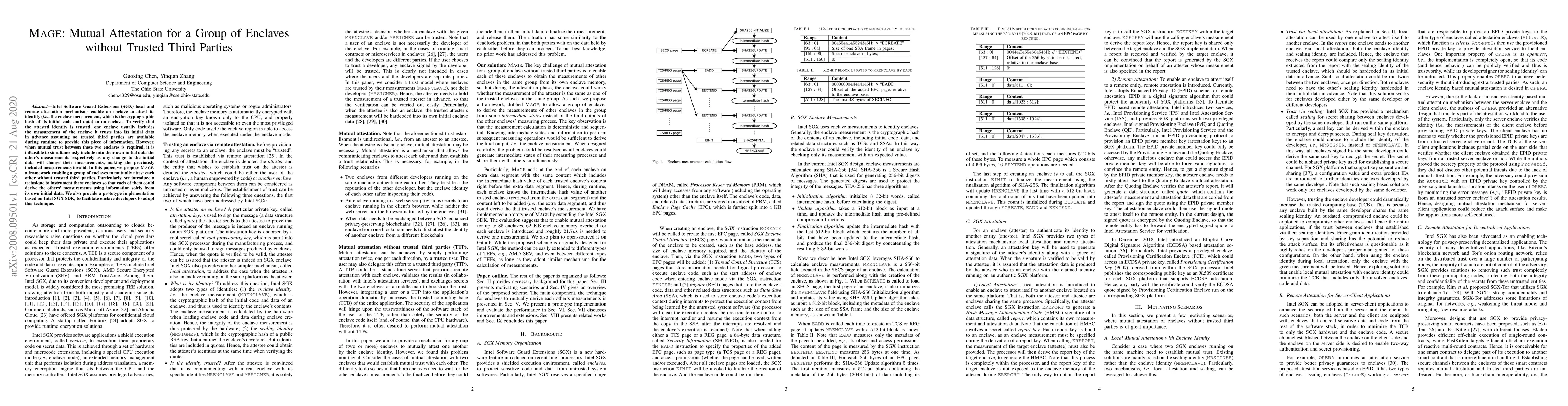 The paper proposes MAGE, a framework for mutual attestation among a group of Intel SGX enclaves without relying on trusted third parties. MAGE enables each enclave to derive the measurements of others using only its own initial data, facilitating mutual trust verification.