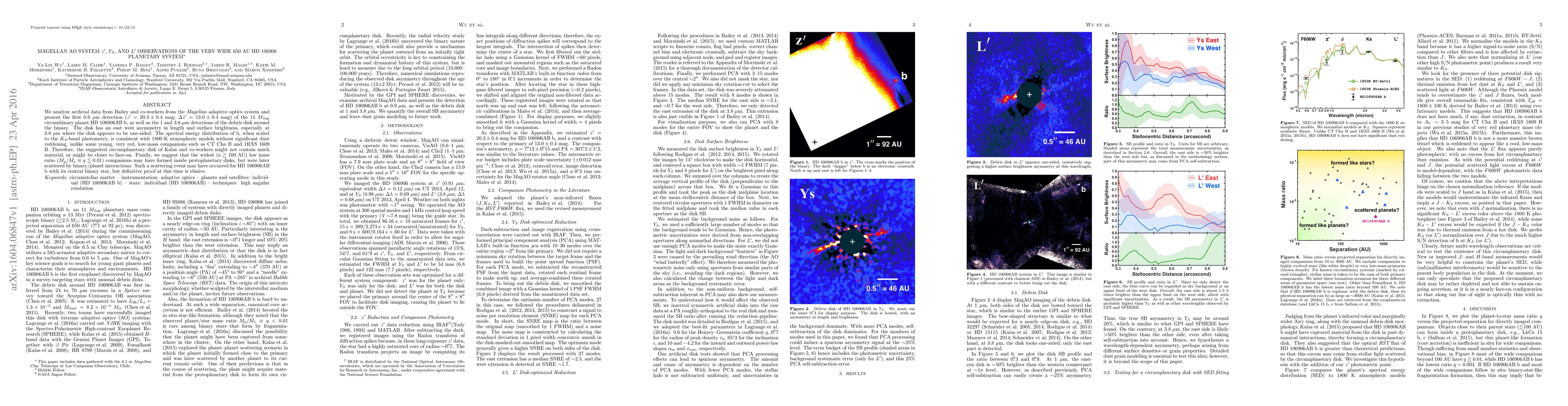 This paper reports the first 0.9 μm detection of the massive circumbinary planet HD 106906AB b using the Magellan AO system, alongside 1 and 3.8 μm observations of the asymmetric debris disk around the binary star. The findings suggest the planet's atmosphere is consistent with 1800 K models, and the disk's asymmetry implies a possible scattering event for the planet.
