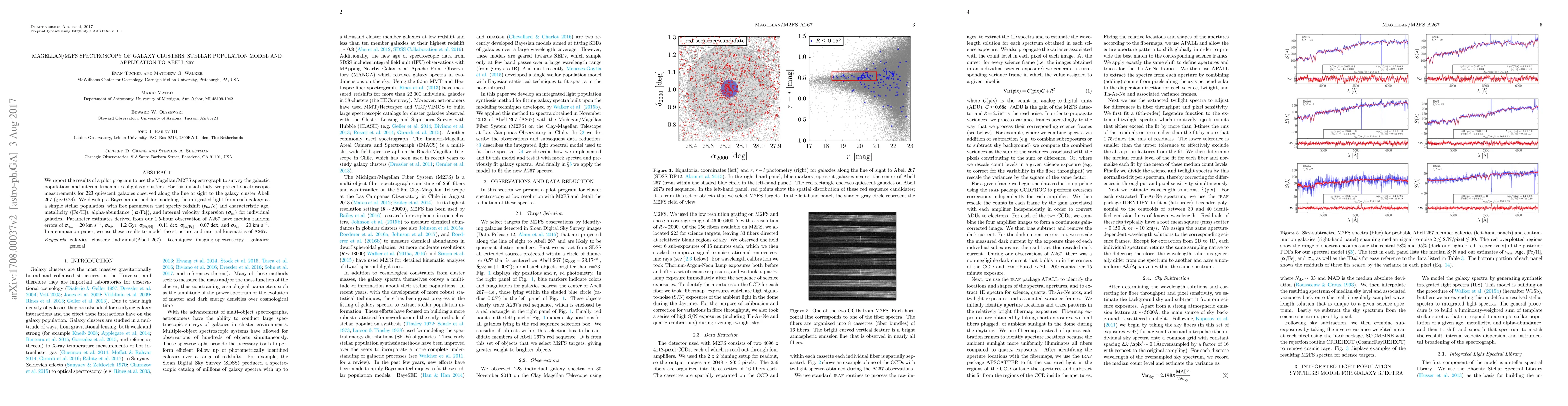 We report the results of a pilot program to use the Magellan/M2FS spectrograph to survey the galactic populations and internal kinematics of galaxy clusters. For this initial study, we present spectroscopic measurements for $223$ quiescent galaxies observed along the line of sight to the galaxy cluster Abell 267 ($z\sim0.23$). We develop a Bayesian method for modeling the integrated light from each galaxy as a simple stellar population, with free parameters that specify redshift ($v_\mathrm{los}/c$) and characteristic age, metallicity ($\mathrm{[Fe/H]}$), alpha-abundance ($[\alpha/\mathrm{Fe}]$), and internal velocity dispersion ($\sigma_\mathrm{int}$) for individual galaxies. Parameter estimates derived from our 1.5-hour observation of A267 have median random errors of $\sigma_{v_\mathrm{los}}=20\ \mathrm{km\ s^{-1}}$, $\sigma_{\mathrm{Age}}=1.2\ \mathrm{Gyr}$, $\sigma_{\mathrm{[Fe/H]}}=0.11\ \mathrm{dex}$, $\sigma_{[\alpha/\mathrm{Fe}]}=0.07\ \mathrm{dex}$, and $\sigma_{\sigma_\mathrm{int}}=20\ \mathrm{km\ s^{-1}}$. In a companion paper, we use these results to model the structure and internal kinematics of A267.