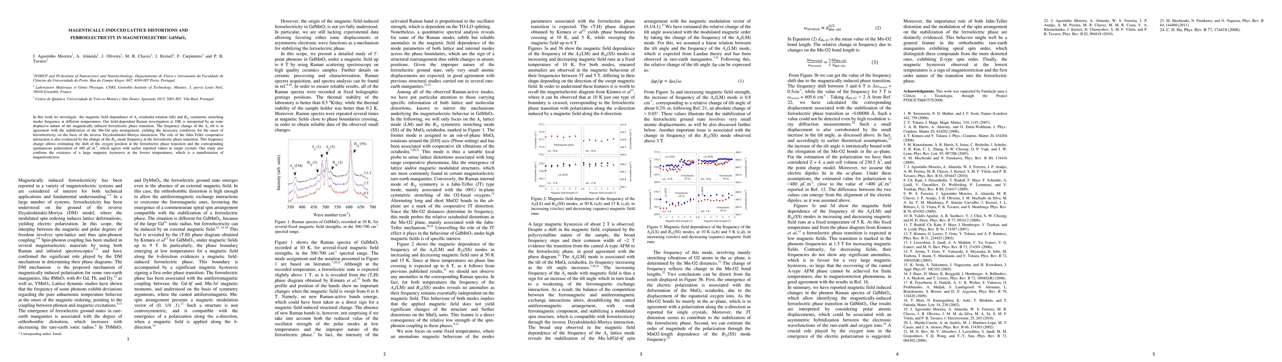 In this work we investigate the magnetic field dependence of Ag octahedra rotation (tilt) and B2g symmetric stretching modes frequency at different temperatures. Our field-dependent Raman investigation at 10K is interpreted by an ionic displacive nature of the magnetically induced ferroelectric phase transition. The frequency change of the Ag tilt is in agreement with the stabilization of the Mn-Gd spin arrangement, yielding the necessary conditions for the onset of ferroelectricity on the basis of the inverse Dzyaloshinskii-Moriya interaction. The role of the Jahn-Teller cooperative interaction is also evidenced by the change of the B2g mode frequency at the ferroelectric phase transition. This frequency change allows estimating the shift of the oxygen position at the ferroelectric phase transition and the corresponding spontaneous polarization of 480 {\mu}C/m2, which agrees with earlier reported values in single crystals. Our study also confirms the existence of a large magnetic hysteresis at the lowest temperatures, which is a manifestation of magnetrostiction.