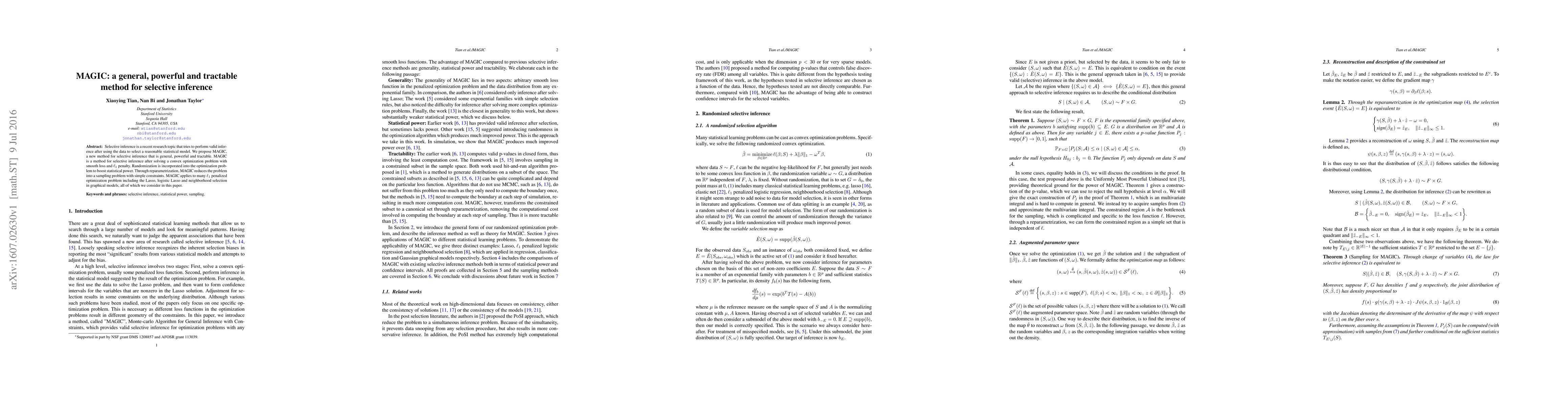 Selective inference is a recent research topic that tries to perform valid inference after using the data to select a reasonable statistical model. We propose MAGIC, a new method for selective inference that is general, powerful and tractable. MAGIC is a method for selective inference after solving a convex optimization problem with smooth loss and $\ell_1$ penalty. Randomization is incorporated into the optimization problem to boost statistical power. Through reparametrization, MAGIC reduces the problem into a sampling problem with simple constraints. MAGIC applies to many $\ell_1$ penalized optimization problem including the Lasso, logistic Lasso and neighborhood selection in graphical models, all of which we consider in this paper.