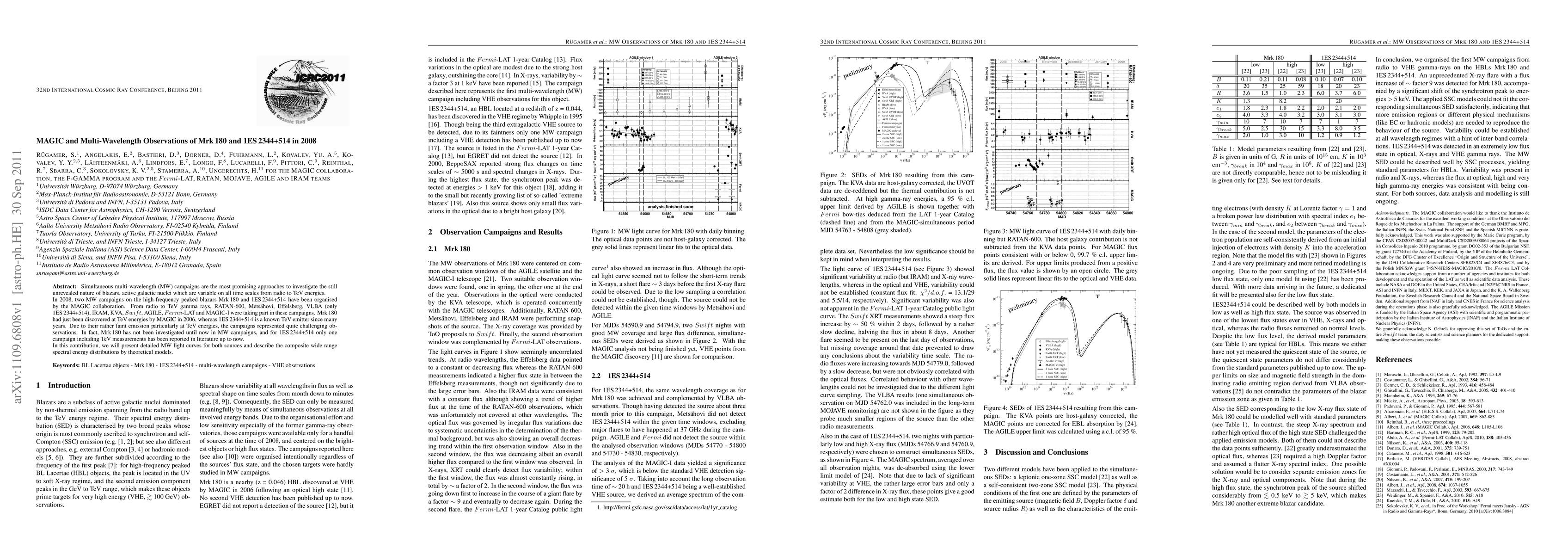 The MAGIC collaboration conducted simultaneous multi-wavelength campaigns on Mrk 180 and 1ES 2344+514 in 2008, utilizing various telescopes across radio, IR, X-ray, and gamma-ray bands. The study presents detailed MW light curves and wide range spectral energy distributions for both sources, contributing to the understanding of high-frequency peaked blazars.
