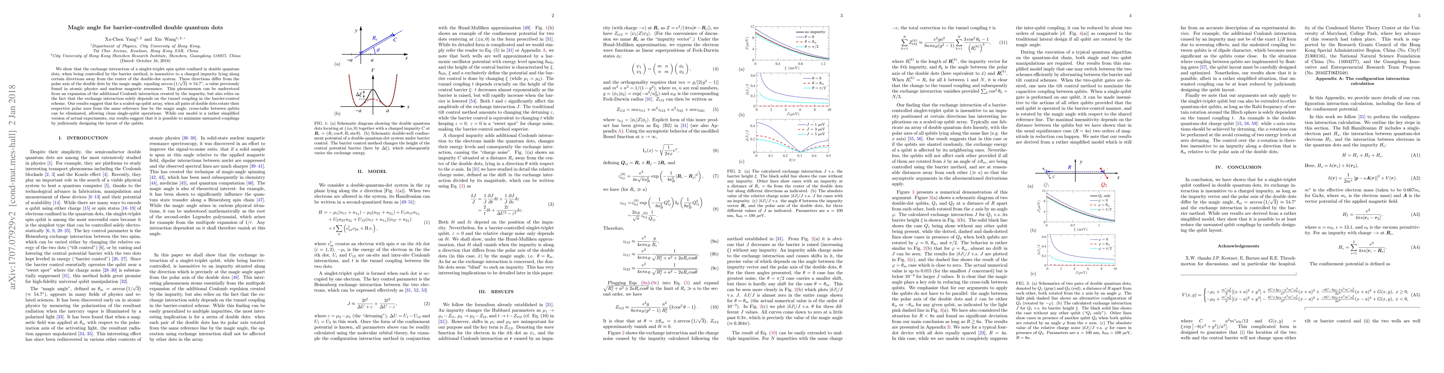 We show that the exchange interaction of a singlet-triplet spin qubit confined in double quantum dots, when being controlled by the barrier method, is insensitive to a charged impurity lying along certain directions away from the center of the double-dot system. These directions differ from the polar axis of the double dots by the magic angle, equaling $\arccos\left(1/\sqrt{3}\right)\approx 54.7^\circ$, a value previously found in atomic physics and nuclear magnetic resonance. This phenomenon can be understood from an expansion of the additional Coulomb interaction created by the impurity, but also relies on the fact that the exchange interaction solely depends on the tunnel coupling in the barrier-control scheme. Our results suggest that for a scaled-up qubit array, when all pairs of double dots rotate their respective polar axes from the same reference line by the magic angle, cross-talks between qubits can be eliminated, allowing clean single-qubit operations. While our model is a rather simplified version of actual experiments, our results suggest that it is possible to minimize unwanted couplings by judiciously designing the layout of the qubits.