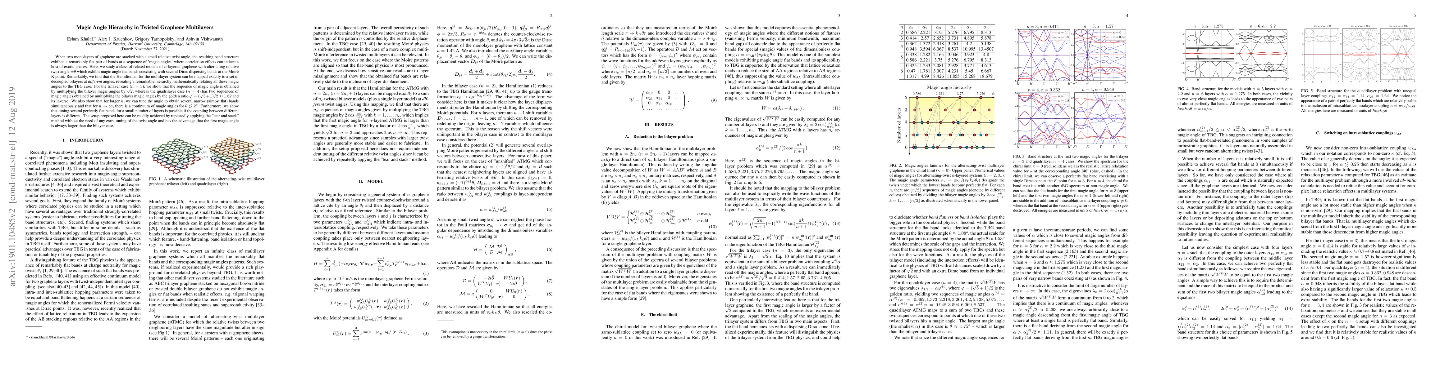 When two monolayers of graphene are stacked with a small relative twist angle, the resulting band structure exhibits a remarkably flat pair of bands at a sequence of 'magic angles' where correlation effects can induce a host of exotic phases. Here, we study a class of related models of $n$-layered graphene with alternating relative twist angle $\pm \theta$ which exhibit magic angle flat bands coexisting with several Dirac dispersing bands at the Moir\'e K point. Remarkably, we find that the Hamiltonian for the multilayer system can be mapped exactly to a set of decoupled bilayers at {\it different} angles, revealing a remarkable hierarchy mathematically relating all these magic angles to the TBG case. For the trilayer case ($n = 3$), we show that the sequence of magic angle is obtained by multiplying the bilayer magic angles by $\sqrt{2}$, whereas the quadrilayer case ($n = 4$) has two sequences of magic angles obtained by multiplying the bilayer magic angles by the golden ratio $\varphi = (\sqrt{5} + 1)/2 \approx 1.62$ and its inverse. We also show that for larger $n$, we can tune the angle to obtain several narrow (almost flat) bands simultaneously and that for $n \rightarrow \infty$, there is a continuum of magic angles for $\theta \lesssim 2^o$. Furthermore, we show that tuning several perfectly flat bands for a small number of layers is possible if the coupling between different layers is different. The setup proposed here can be readily achieved by repeatedly applying the "tear and stack" method without the need of any extra tuning of the twist angle and has the advantage that the first magic angle is always larger than the bilayer case.