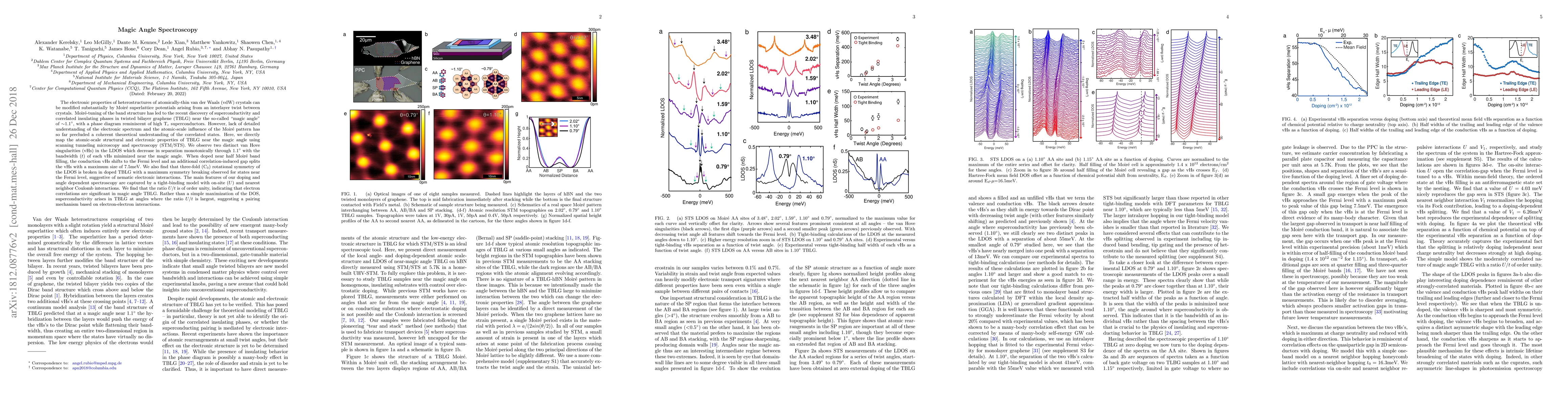 The electronic properties of heterostructures of atomically-thin van der Waals (vdW) crystals can be modified substantially by Moir\'e superlattice potentials arising from an interlayer twist between crystals. Moir\'e-tuning of the band structure has led to the recent discovery of superconductivity and correlated insulating phases in twisted bilayer graphene (TBLG) near the so-called "magic angle" of $\sim$1.1{\deg}, with a phase diagram reminiscent of high T$_c$ superconductors. However, lack of detailed understanding of the electronic spectrum and the atomic-scale influence of the Moir\'e pattern has so far precluded a coherent theoretical understanding of the correlated states. Here, we directly map the atomic-scale structural and electronic properties of TBLG near the magic angle using scanning tunneling microscopy and spectroscopy (STM/STS). We observe two distinct van Hove singularities (vHs) in the LDOS which decrease in separation monotonically through 1.1{\deg} with the bandwidth (t) of each vHs minimized near the magic angle. When doped near half Moir\'e band filling, the conduction vHs shifts to the Fermi level and an additional correlation-induced gap splits the vHs with a maximum size of 7.5 meV. We also find that three-fold (C$_3$) rotational symmetry of the LDOS is broken in doped TBLG with a maximum symmetry breaking observed for states near the Fermi level, suggestive of nematic electronic interactions. The main features of our doping and angle dependent spectroscopy are captured by a tight-binding model with on-site (U) and nearest neighbor Coulomb interactions. We find that the ratio U/t is of order unity, indicating that electron correlations are significant in magic angle TBLG. Rather than a simple maximization of the DOS, superconductivity arises in TBLG at angles where the ratio U/t is largest, suggesting a pairing mechanism based on electron-electron interactions.