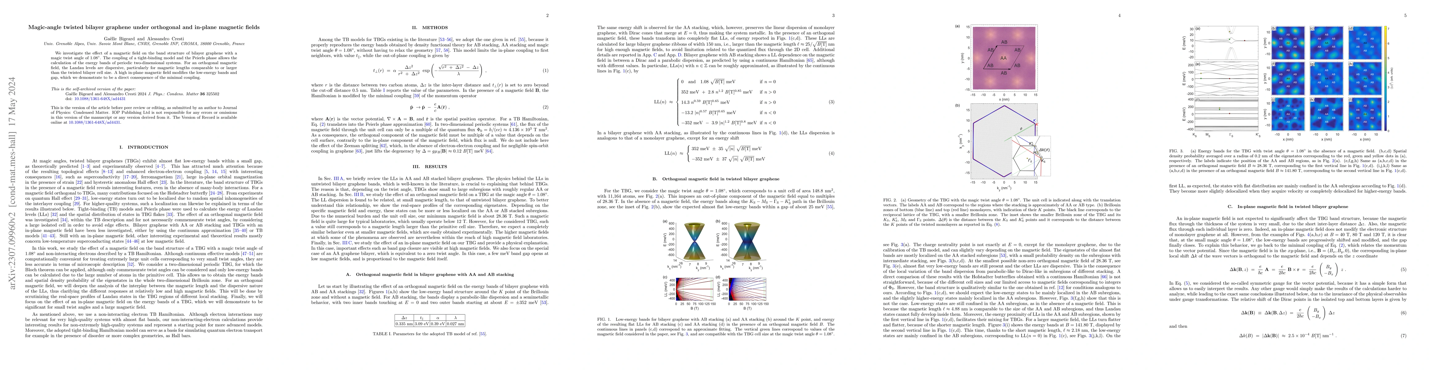 This study examines the influence of orthogonal and in-plane magnetic fields on the band structure of magic-angle twisted bilayer graphene, revealing dispersive Landau levels under orthogonal fields and modifications in low-energy bands and gap due to in-plane fields, highlighting the role of minimal coupling.