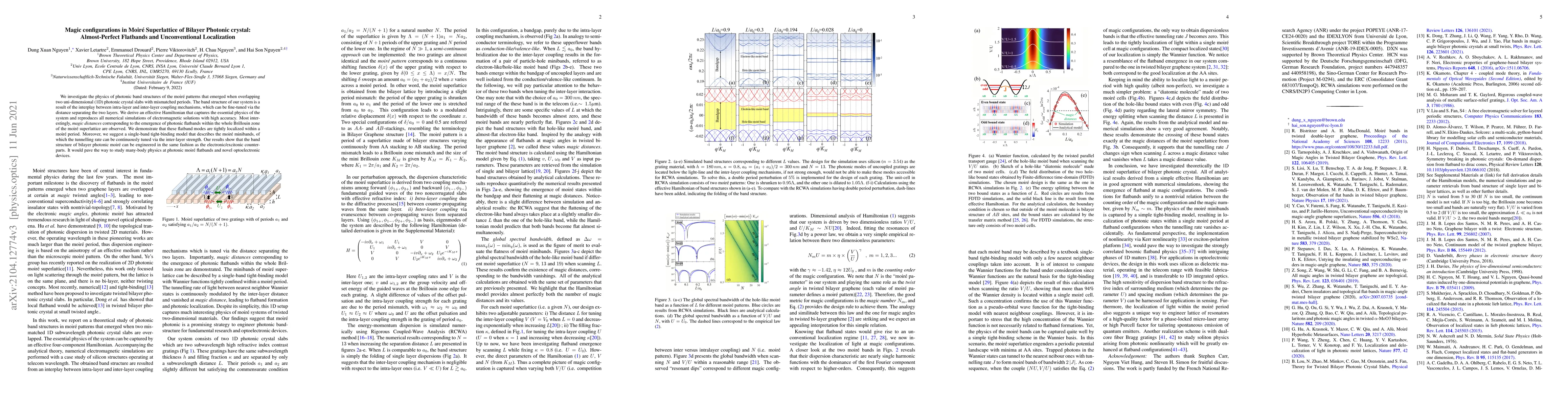 This paper explores the photonic band structure of moiré superlattices formed by overlapping two mismatched photonic crystal slabs, revealing almost-perfect flatbands and unconventional localization at specific "magic distances." An effective Hamiltonian model is developed to accurately describe the system, highlighting the potential for engineering the band structure and paving the way for novel optoelectronic devices.