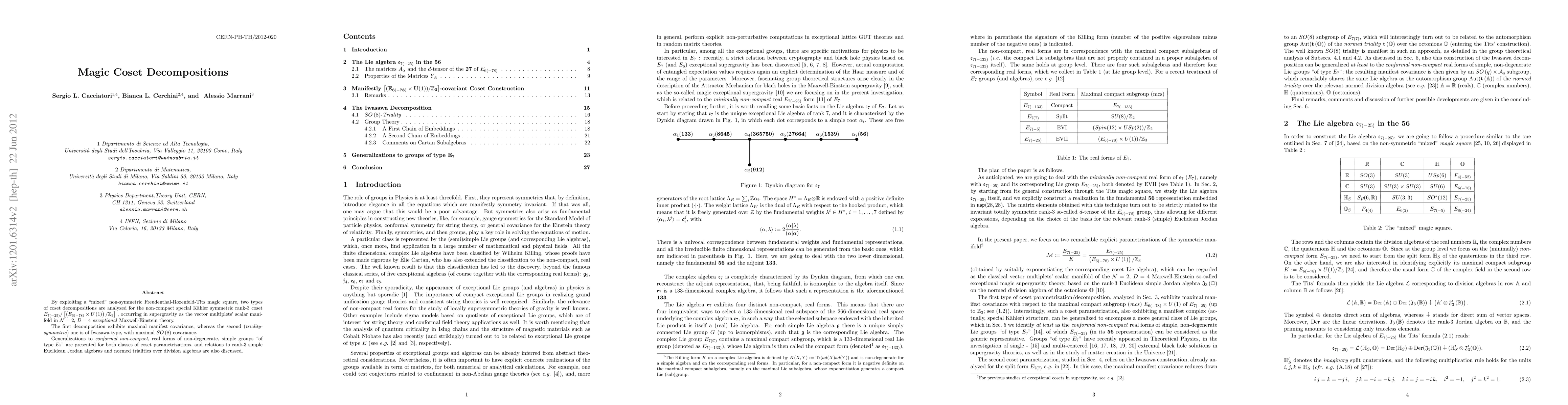 By exploiting a "mixed" non-symmetric Freudenthal-Rozenfeld-Tits magic square, two types of coset decompositions are analyzed for the non-compact special K\"ahler symmetric rank-3 coset E7(-25)/[(E6(-78) x U(1))/Z_3], occurring in supergravity as the vector multiplets' scalar manifold in N=2, D=4 exceptional Maxwell-Einstein theory. The first decomposition exhibits maximal manifest covariance, whereas the second (triality-symmetric) one is of Iwasawa type, with maximal SO(8) covariance. Generalizations to conformal non-compact, real forms of non-degenerate, simple groups "of type E7" are presented for both classes of coset parametrizations, and relations to rank-3 simple Euclidean Jordan algebras and normed trialities over division algebras are also discussed.