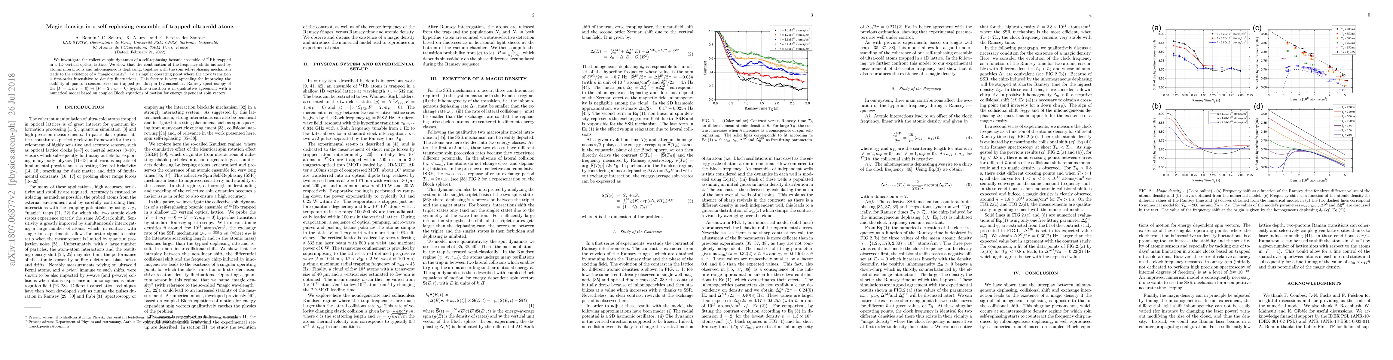 This paper explores the collective spin dynamics of a self-rephasing bosonic ensemble of $^{87}$Rb atoms in a 1D optical lattice, revealing a "magic density" where the clock transition is insensitive to density fluctuations. This finding enhances the stability of quantum sensors using trapped pseudo-spin-1/2 ensembles, supported by Ramsey spectroscopy and numerical modeling.