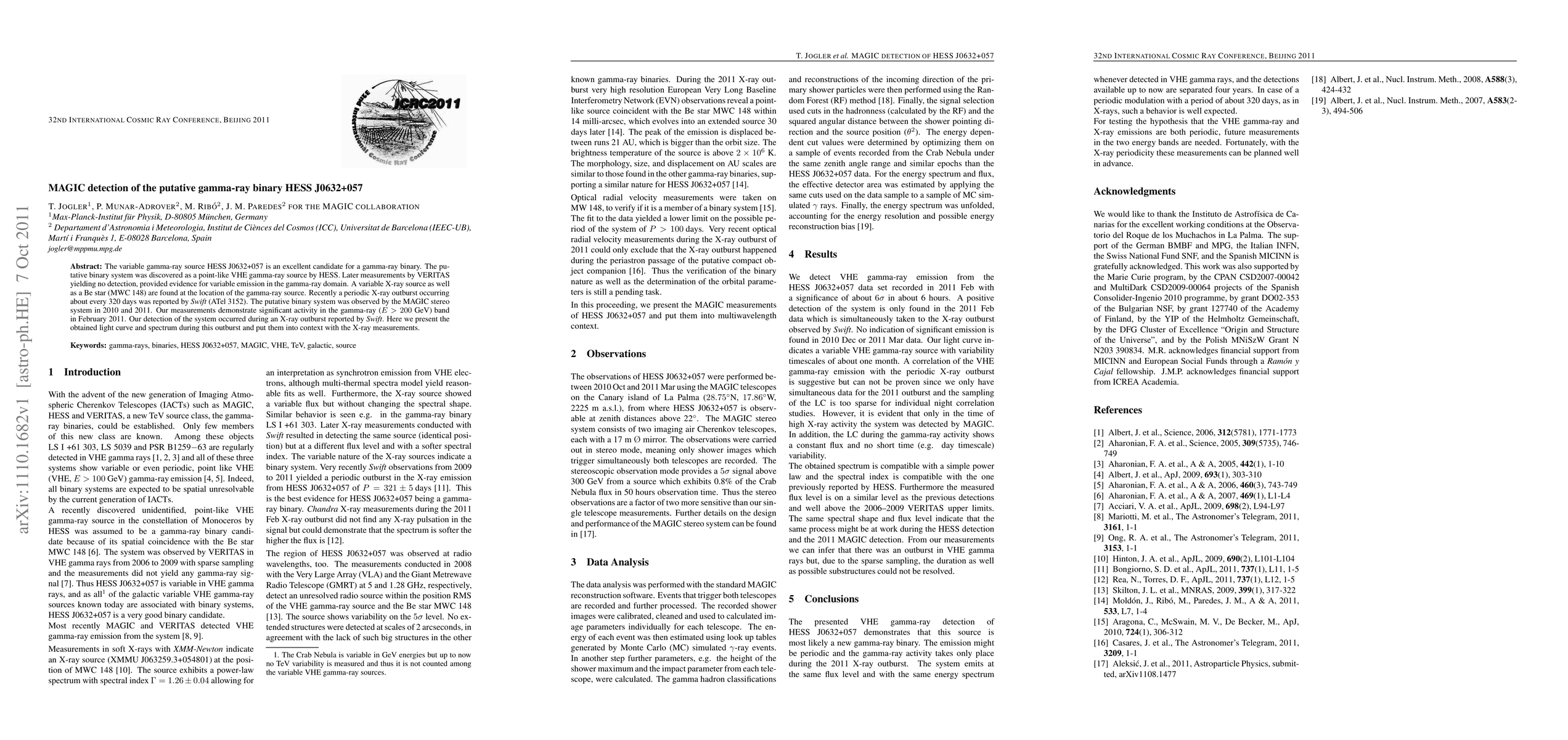 The variable gamma-ray source HESS J0632+057 is an excellent candidate for a gamma-ray binary. The putative binary system was discovered as a point-like VHE gamma-ray source by HESS. Later measurements by VERITAS yielding no detection, provided evidence for variable emission in the gamma-ray domain. A variable X-ray source as well as a Be star (MWC 148) are found at the location of the gamma-ray source. Recently a periodic X-ray outburst occurring about every 320 days was reported by Swift (ATel 3152). The putative binary system was observed by the MAGIC stereo system in 2010 and 2011. Our measurements demonstrate significant activity in the gamma-ray (E > 200 GeV) band in February 2011. Our detection of the system occurred during an X-ray outburst reported by Swift. Here we present the obtained light curve and spectrum during this outburst and put them into context with the X-ray measurements.