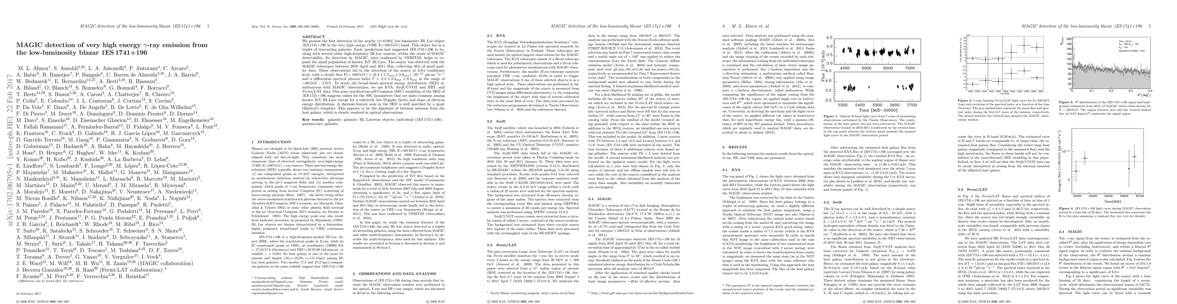 We present the first detection of the nearby (z=0.084) low-luminosity BL Lac object 1ES 1741+196 in the very high energy (VHE: E$>$100 GeV) band. This object lies in a triplet of interacting galaxies. Early predictions had suggested 1ES 1741+196 to be, along with several other high-frequency BL Lac sources, within the reach of MAGIC detectability. Its detection by MAGIC, later confirmed by VERITAS, helps to expand the small population of known TeV BL Lacs. The source was observed with the MAGIC telescopes between 2010 April and 2011 May, collecting 46 h of good quality data. These observations led to the detection of the source at 6.0 $\sigma$ confidence level, with a steady flux $\mathrm{F}(> 100 {\rm GeV}) = (6.4 \pm 1.7_{\mathrm{stat}}\pm 2.6_{\mathrm{syst}}) \cdot 10^{-12}$ ph cm$^{-2}$ s$^{-1}$ and a differential spectral photon index $\Gamma = 2.4 \pm 0.2_{\mathrm{stat}} \pm 0.2_{\mathrm{syst}}$ in the range of $\sim$80 GeV - 3 TeV. To study the broad-band spectral energy distribution (SED) simultaneous with MAGIC observations, we use KVA, Swift/UVOT and XRT, and Fermi/LAT data. One-zone synchrotron-self-Compton (SSC) modeling of the SED of 1ES 1741+196 suggests values for the SSC parameters that are quite common among known TeV BL Lacs except for a relatively low Doppler factor and slope of electron energy distribution. A thermal feature seen in the SED is well matched by a giant elliptical's template. This appears to be the signature of thermal emission from the host galaxy, which is clearly resolved in optical observations.