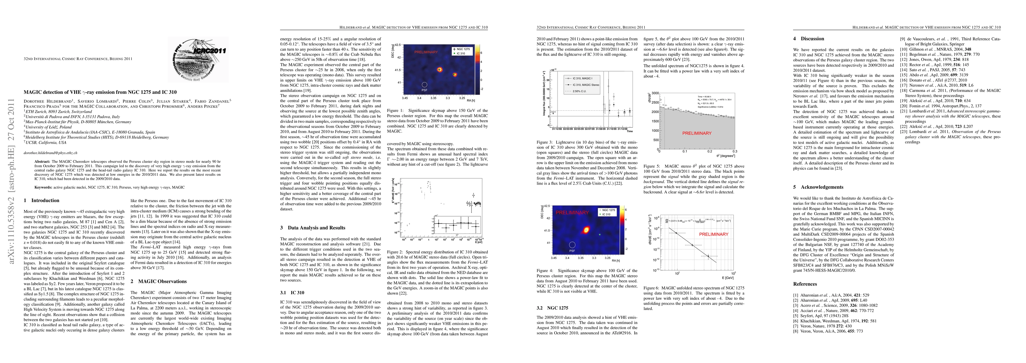 The MAGIC Cherenkov telescopes, located on the Canary Island of La Palma, observed the Perseus cluster in stereo mode for approximately 90 hours from October 2009 to February 2011, leading to the discovery of very high energy (VHE) gamma-ray emission from NGC 1275 and IC 310.