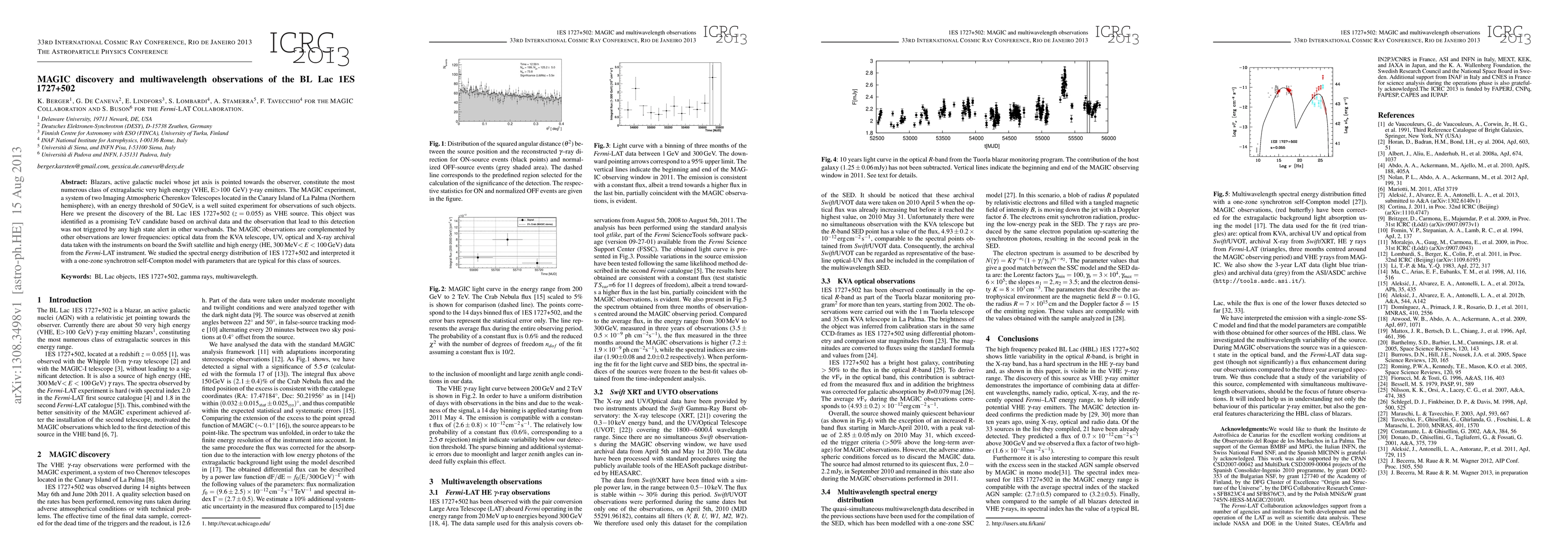 Blazars, active galactic nuclei whose jet axis is pointed towards the observer, constitute the most numerous class of extragalactic very high energy (VHE, E > 100\, GeV) gamma-ray emitters. The MAGIC experiment, a system of two Imaging Atmospheric Cherenkov Telescopes located in the Canary Island of La Palma (Northern hemisphere), with an energy threshold of 50 GeV, is a well suited experiment for observations of such objects. Here we present the discovery of the BL Lac 1ES 1727+502 (z = 0.055) as VHE source. This object was identified as a promising TeV candidate based on archival data and the observation that lead to this detection was not triggered by any high state alert in other wavebands. The MAGIC observations are complemented by other observations are lower frequencies: optical data from the KVA telescope, UV, optical and X-ray archival data taken with the instruments on board the Swift satellite and high energy (HE, 300 MeV < E < 100 GeV) data from the \textit{Fermi}-LAT instrument. We studied the spectral energy distribution of 1ES 1727+502 and interpreted it with a one-zone synchrotron self-Compton model with parameters that are typical for this class of sources.