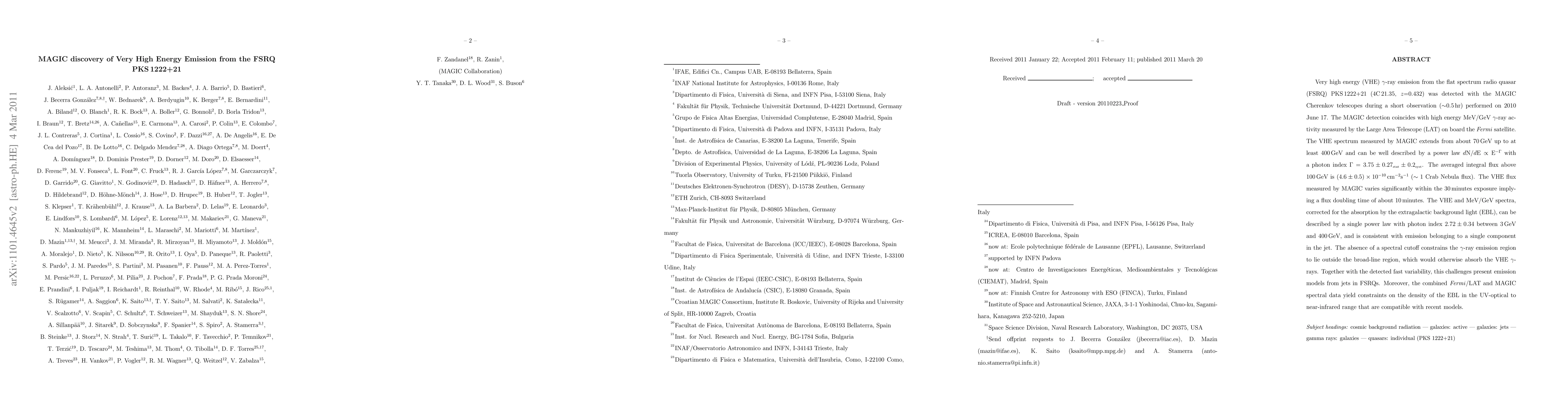 The MAGIC telescopes detected VHE gamma-ray emission from the FSRQ PKS 1222+21, coinciding with high energy MeV/GeV gamma-ray activity from the Fermi satellite. The VHE spectrum extends from 70 GeV to at least 400 GeV, suggesting fast variability and challenging current emission models for FSRQ jets.