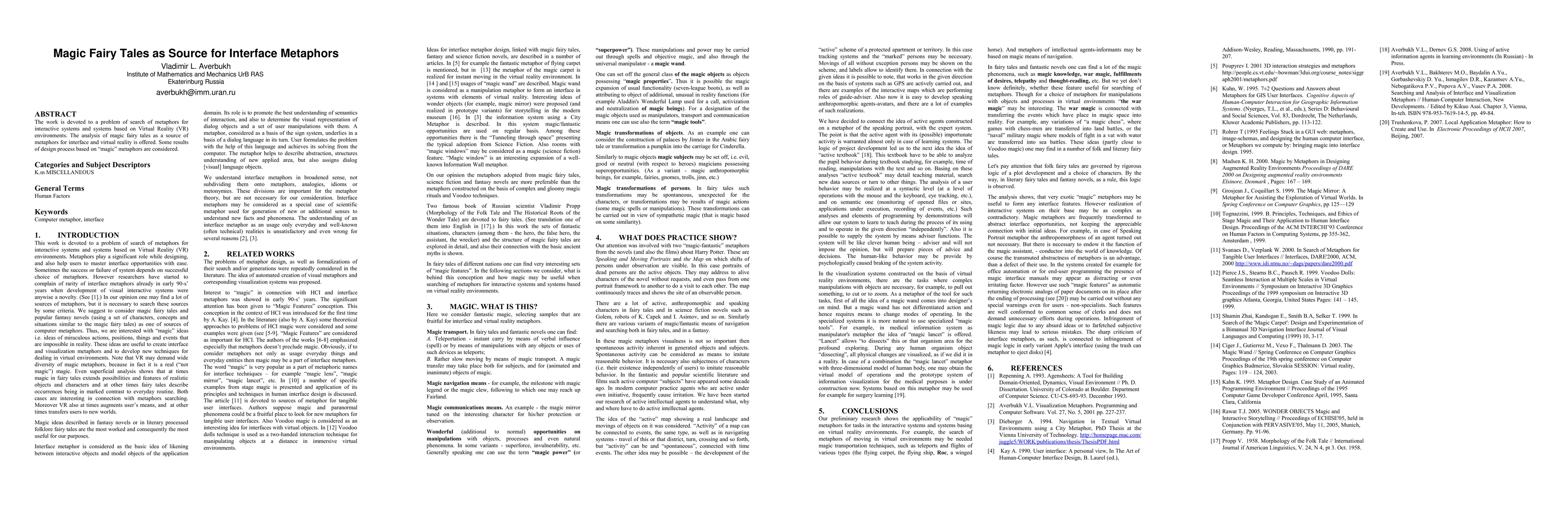 The work is devoted to a problem of search of metaphors for interactive systems and systems based on Virtual Reality (VR) environments. The analysis of magic fairy tales as a source of metaphors for interface and virtual reality is offered. Some results of design process based on magic metaphors are considered.