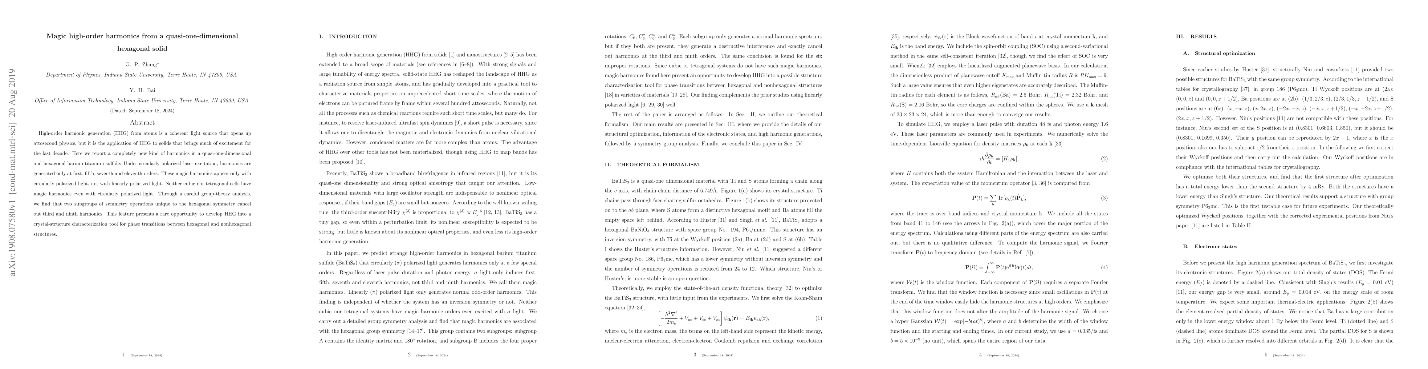 High-order harmonic generation (HHG) from atoms is a coherent light source that opens up attosecond physics, but it is the application of HHG to solids that brings much of excitement for the last decade. Here we report a completely new kind of harmonics in a quasi-one-dimensional and hexagonal barium titanium sulfide: Under circularly polarized laser excitation, harmonics are generated only at first, fifth, seventh and eleventh orders. These magic harmonics appear only with circularly polarized light, not with linearly polarized light. Neither cubic nor tetragonal cells have magic harmonics even with circularly polarized light. Through a careful group-theory analysis, we find that two subgroups of symmetry operations unique to the hexagonal symmetry cancel out third and ninth harmonics. This feature presents a rare opportunity to develop HHG into a crystal-structure characterization tool for phase transitions between hexagonal and nonhexagonal structures.