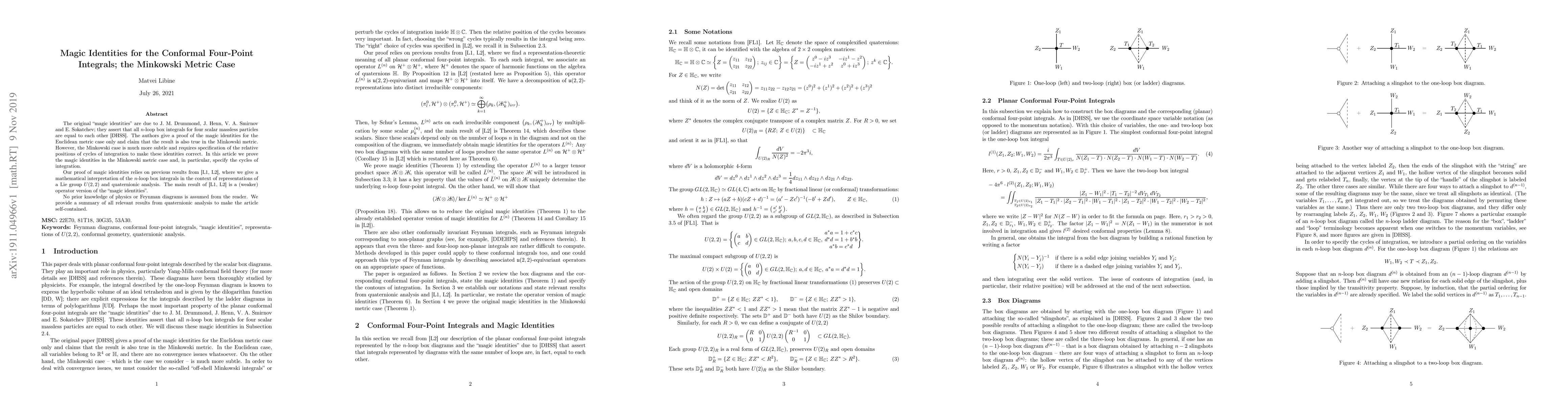 This paper proves the "magic identities" for n-loop box integrals in the Minkowski metric case, addressing the subtleties that arise compared to the Euclidean case. The authors utilize results from quaternionic analysis and representations of the Lie group U(2,2) to specify the necessary cycles of integration, making the identities valid in this context.