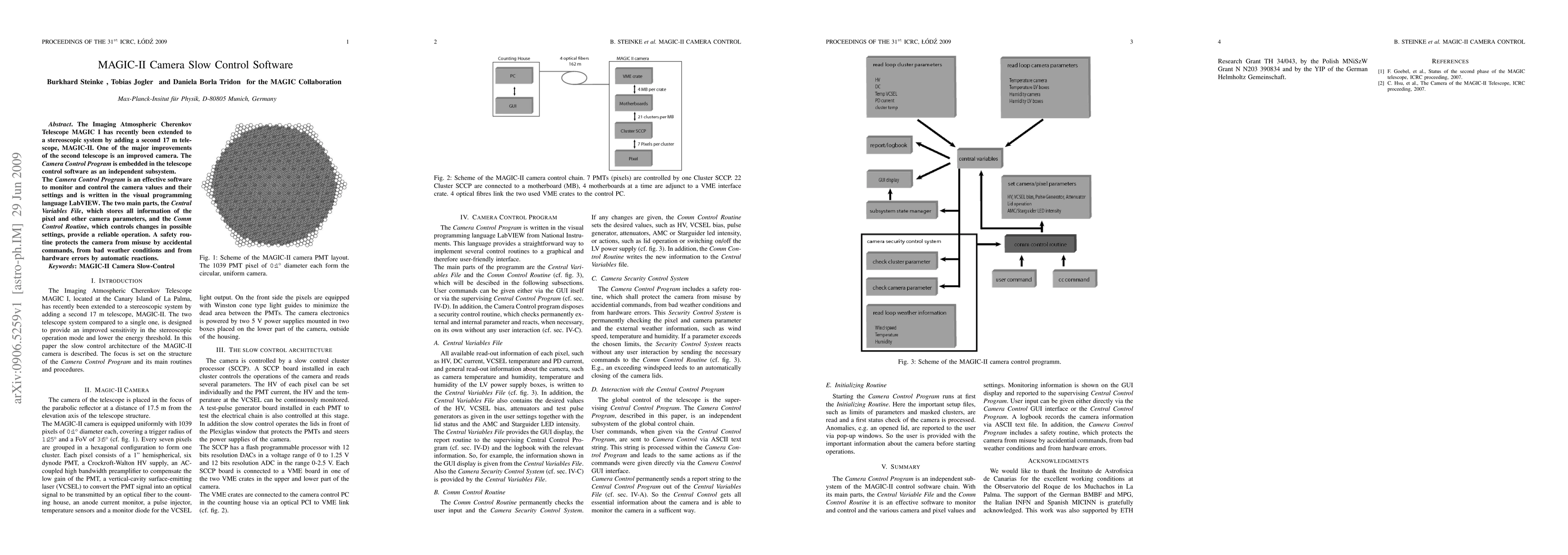 The MAGIC-II Camera Control Program, written in LabVIEW, effectively monitors and controls the camera settings for the stereoscopic MAGIC system. It includes a Central Variables File for parameter storage and a Comm Control Routine for setting changes, with a safety routine to prevent misuse and hardware errors.