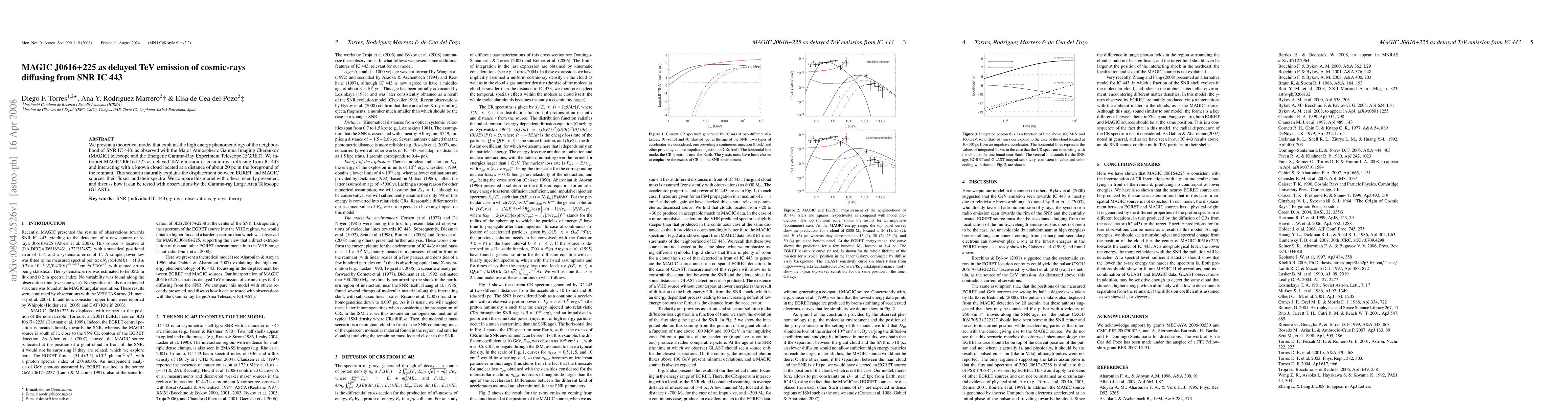 The paper presents a theoretical model explaining the high-energy emissions near SNR IC 443, attributing MAGIC J0616+225's TeV emission to cosmic-rays diffusing from IC 443 and interacting with a nearby cloud, which accounts for observed differences in EGRET and MAGIC data. The proposed model is compared with others and suggests further validation with GLAST observations.