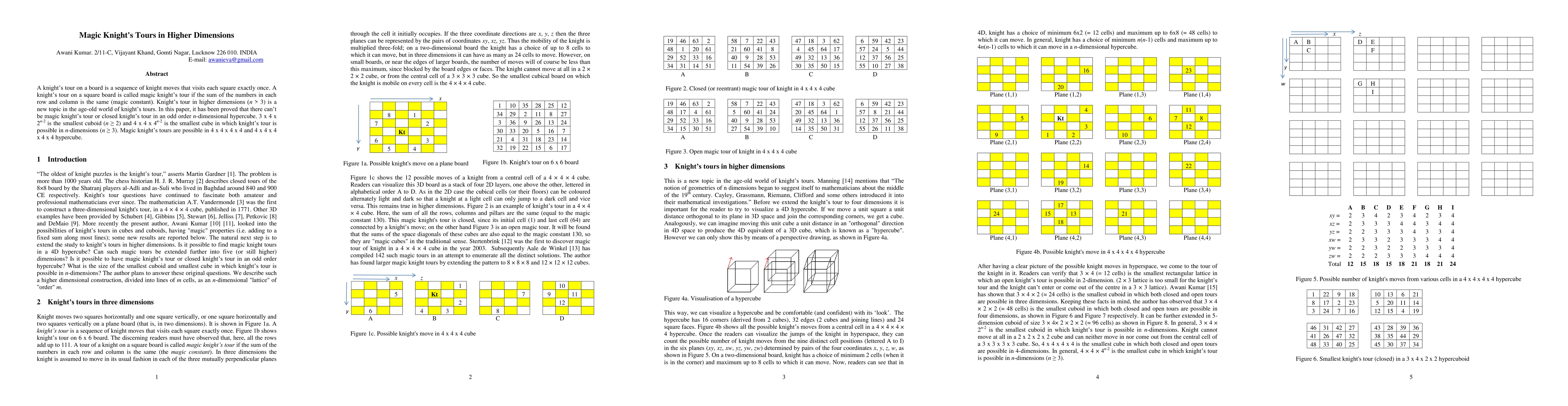 A knight's tour on a board is a sequence of knight moves that visits each square exactly once. A knight's tour on a square board is called magic knight's tour if the sum of the numbers in each row and column is the same (magic constant). Knight's tour in higher dimensions (n > 3) is a new topic in the age-old world of knight's tours. In this paper, it has been proved that there can't be magic knight's tour or closed knight's tour in an odd order n-dimensional hypercube. 3 \times 4 \times 2n-2 is the smallest cuboid (n \geq 2) and 4 \times 4 \times 4n-2 is the smallest cube in which knight's tour is possible in n-dimensions (n \geq 3). Magic knight's tours are possible in 4 \times 4 \times 4 \times 4 and 4 \times 4 \times 4 \times 4 \times 4 hypercube.