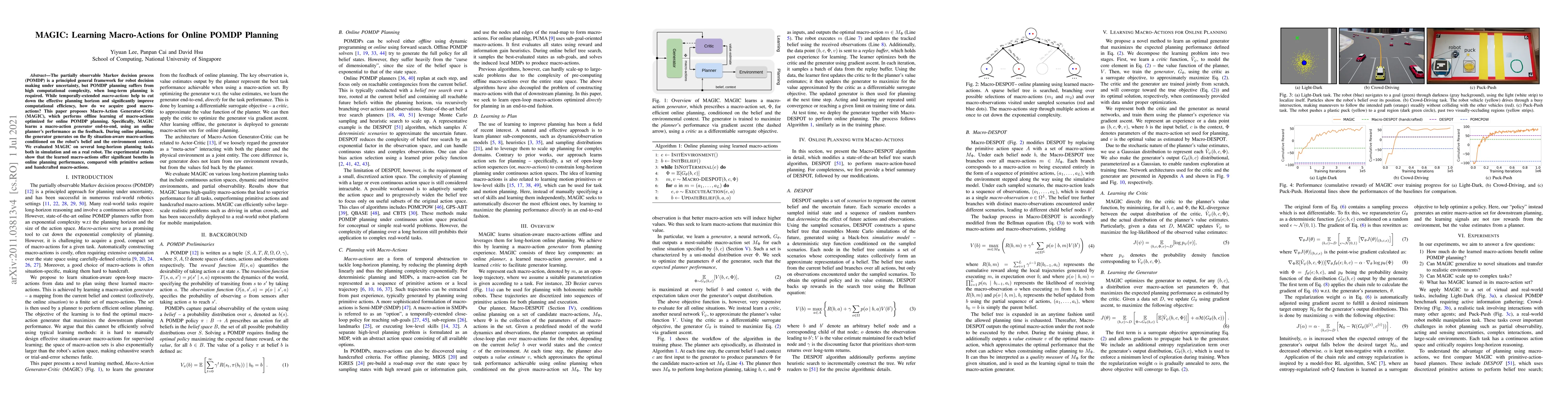 The MAGIC framework learns optimized macro-actions for online POMDP planning, significantly improving computational efficiency. Experimental results show that MAGIC-generated macro-actions outperform both primitive actions and handcrafted alternatives in long-horizon planning tasks.