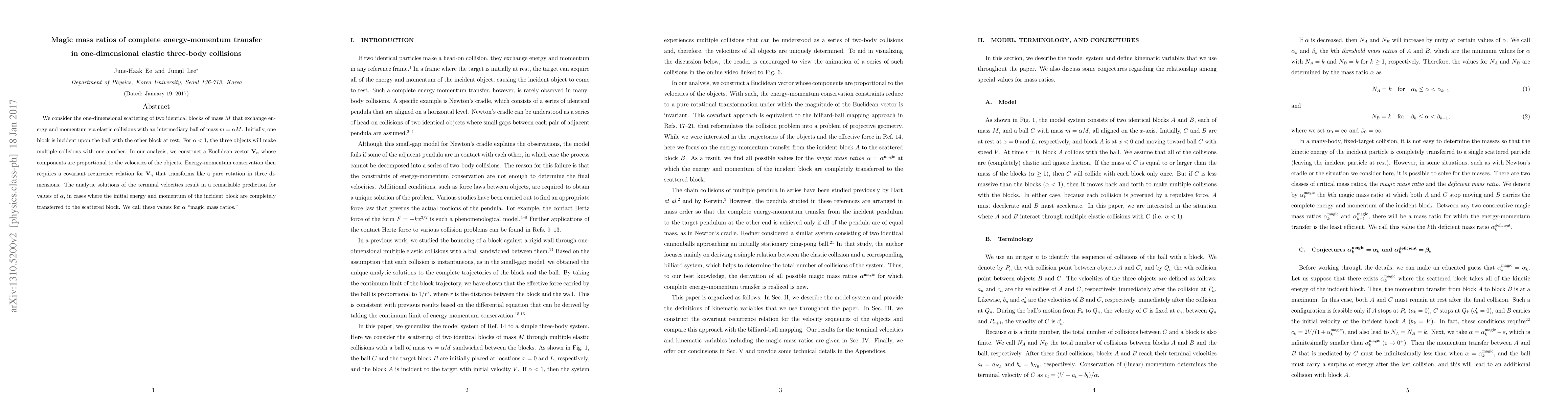 We consider the one-dimensional scattering of two identical blocks of mass $M$ that exchange energy and momentum via elastic collisions with an intermediary ball of mass $m=\alpha M$. Initially, one block is incident upon the ball with the other block at rest. For $\alpha<1$, the three objects will make multiple collisions with one another. In our analysis, we construct a Euclidean vector $\textbf{V}_n$ whose components are proportional to the velocities of the objects. Energy-momentum conservation then requires a covariant recurrence relation for $\textbf{V}_n$ that transforms like a pure rotation in three dimensions. The analytic solutions of the terminal velocities result in a remarkable prediction for values of $\alpha$, in cases where the initial energy and momentum of the incident block are completely transferred to the scattered block. We call these values for $\alpha$ "magic mass ratios."